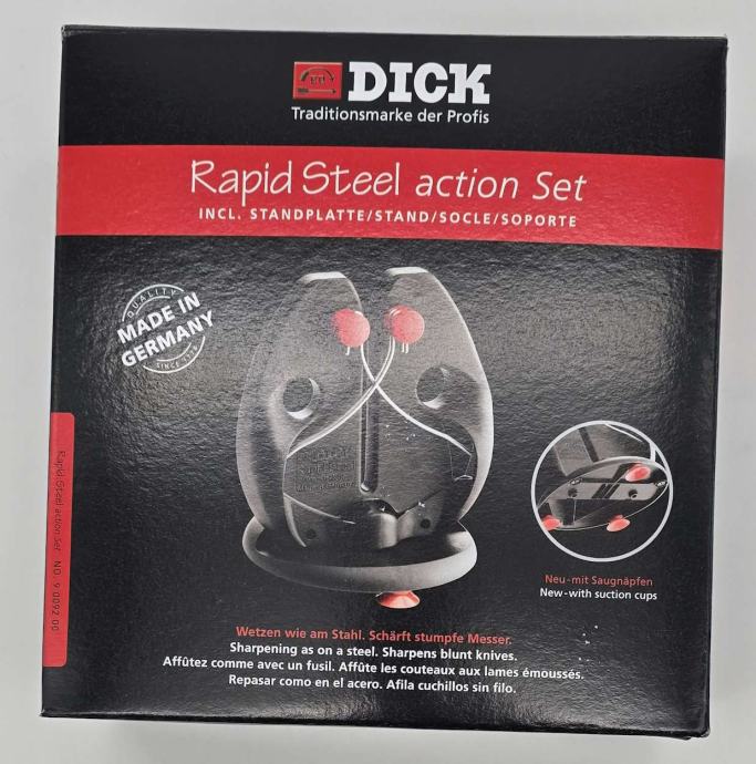 Dick Rapid Steel Action Set je profesionalni alat dizajniran za brzo i jednostavno oštrenje noževa. Idealan je za kuhare, mesare i sve koji žele održavati svoje noževe oštrima uz minimalan napor. Set se sastoji od čeličnih šipki s izuzetno tvrdim premazom otpornim na habanje, što omogućuje učinkovito i precizno oštrenje.