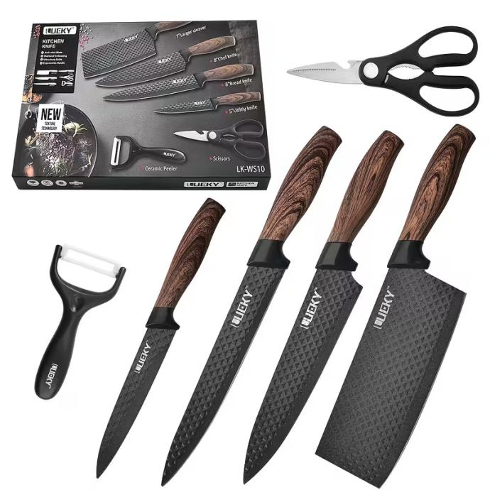 Set kuhinjskih noževa, oštra oštrica od nehrđajućeg čelika, izvrsna izdržljivost, s ergonomskom drškom, škarama i gulilicom, otporan na hrđu i jednostavan za čišćenje, elegantno pakiranje prikladno za poklone