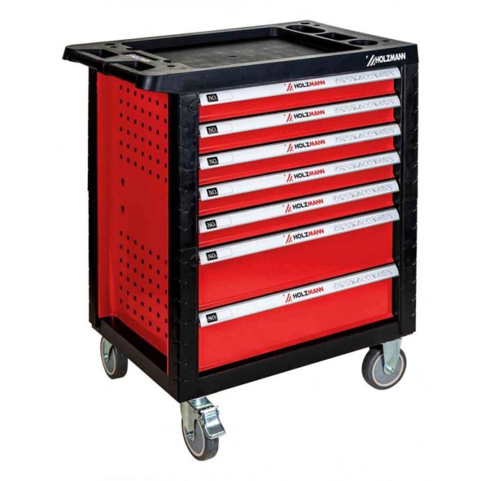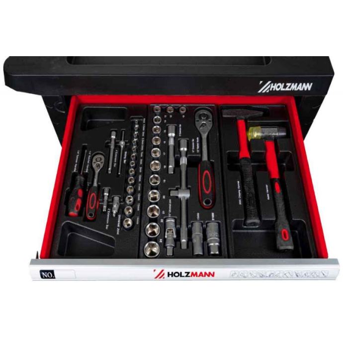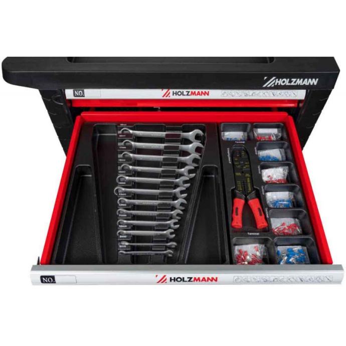 HOLZMANN ormarić za alat WW770W ima sedam ladica u dvije različite veličine, a sve su opremljene glatko pokretnim kliznim klizačima s kugličnim ležajevima. Nudi praktičnu površinu za pohranu, čvrstu ručku i bravu za sigurno zatvaranje ladica. Glatko pokretni kotači s kočnicama osiguravaju jednostavnu pokretljivost i stabilno postolje. Kolica dolaze s opsežnim setom alata od 261 dijela izrađenim od visokokvalitetnog krom-vanadij čelika – savršeno za profesionalnu i kućnu upotrebu.