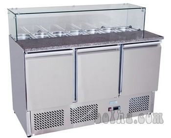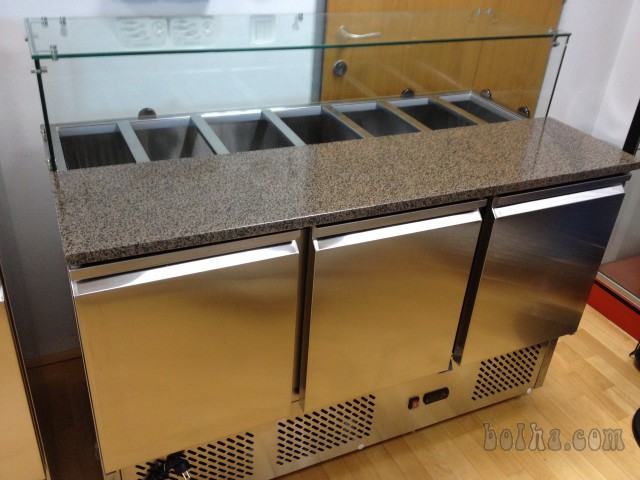 Pult za pizzu ili pult za pripremanje ostalih jela, sa staklenom vitrinom 3 vrata sa unutrašnjom policom, hlađenje +2 do -10 stupnjeva, dimenzije 1365x700x970 mm, novo pod garancijom, cijena ne uključuje GN kade.