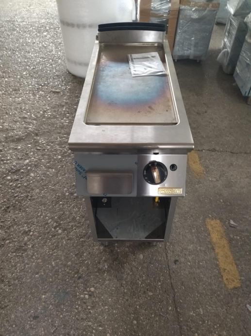 Radna ploha izrađena iz jednog komada od AISI 304 nehrđajućeg čelika 20/10 sa scotch brite završnom obradom. Radna površina sa zaobljenim prednjim rubom. Rubovi stranica pod pravim kutom za savršeno slaganje linije. Ploča roštilja debljine 16mm, čelična ravna sa zaobljenim uglovima, uvarena sa svih strana s nagibom prema ispustu u gornju plohu. Dimenzije aktivnog dijela ploče: 335x700mm. Ispust masnoće promjera 33mm. Velika posuda za masnoću kapaciteta 3 litre. Ispred radne ploče hladna zona dubine 75mm. Ergonomski oblikovan sustav upravljanja. Podešavanje temperature u području 100° do 300°C. Dva štapna plamenika visoke energetske učinkovitosti s 4 reda plamena, ukupne snage 2x5,5kW, izrađeni iz vatrootpornog inox lima. Paljenje preko pripalnog plamenika pomoću piezzo upaljača sa zaštitnom kapicom i ugrađene svjećice. Osiguranje od nekontroliranog istjecanja plina preko sigurnosnog ventila i ugrađenog termoelementa. Vanjske stranice izrađene od nehrđajućeg čelika sa scotch brite završnom obradom. Otvoreni ormarić za skladištenje posuda, tava, pladnjeva i sl. Noge izrađene od AISI 304 s regulacijom visine od 50mm.
