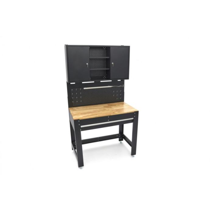 Ovaj elegantni radni stol s drvenom radnom pločom vrlo je prikladan i za profesionalnu i za hobi sobu "uradi sam". Kompaktni radni stol u potpunosti je opremljen korisnim dodacima, kao što su razdjelnik, stalak za vješanje, LED rasvjeta i praktični ormarići koji se mogu zaključati za spremanje dragocjenosti. Radni stol također ima tri praktične police za odlaganje na koje možete staviti često korištene predmete. Radni stol se također može kombinirati s drugim namještajem za radni stol ako želite proširiti radni stol.Ovaj vrhunski radni stol prikladan je za montažu na zid, a zahvaljujući svom kompaktnom dizajnu pristaje u gotovo svaki radni prostor. Ako stražnju stijenku sa stijenkom ormarića pričvrstite na zid, osigurat ćete vrlo dobru stabilnost. Radni stol ima i dosta prostora za pohranu, pa se može rasporediti po želji vlastitim alatom i materijalima. Na primjer, možete koristiti praktičnu ploču s kukama, prostrane ormare koji se zaključavaju s ključem i široku ladicu za pohranu.Tehnički opis:Dimenzije sklopljene (ŠxDxV) 115 x 61 x 206 cm.Dimenzije bez stražnje stijenke (ŠxDxV) 115 x 61 x 91 cmUnutarnje dimenzije ladice (ŠxDxV) 91,5 x 39 x 9 cmDimenzije radne ploče (ŠxDxV) 114 x 58 x 2 cmDimenzije ormarića (ŠxDxV) 37 x 16 x 60 cmRazmak između ormara (ŠxV) 37 x 60 cmVisina stražnjeg zida 49,5 cmSredišnji razmak stražnjeg zida 25 mmVisina između poda i ladice 68 cmVisina između poda i radne ploče 91 cmŠirina lampe 54 cmDimenzije pakiranja 117 x 64 x 11 cm]]>