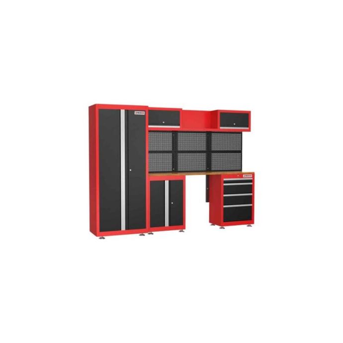 HOLZMANN kolekcija za organizaciju radionica od 13 komada osigurava red i radni prostor u vašoj radionici, garaži, podrumu ili sobi za hobije. Zahvaljujući modularnim komponentama fleksibilno se sastavljaju i brojni prostori za pohranu i radna površina su obavezni. Ormar je opremljen s tri police koje se mogu birati po visini. Zidni ormarići opremljeni su plinskim oprugama za udobno otvaranje i zatvaranje. Vrata i ladice koje se mogu zaključati, podešavanje visine za izravnavanje proizvoda i podna ploča upotpunjuju ovaj proizvod visoke kvalitete. Proizvod dolazi u jednom paketu, a pojedinačni ormarići su već sastavljeni tako da je transport i montaža laka.