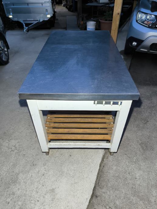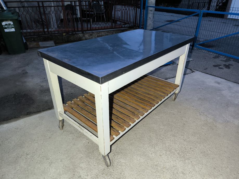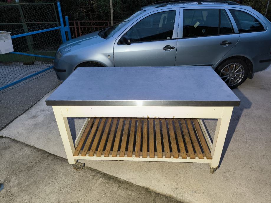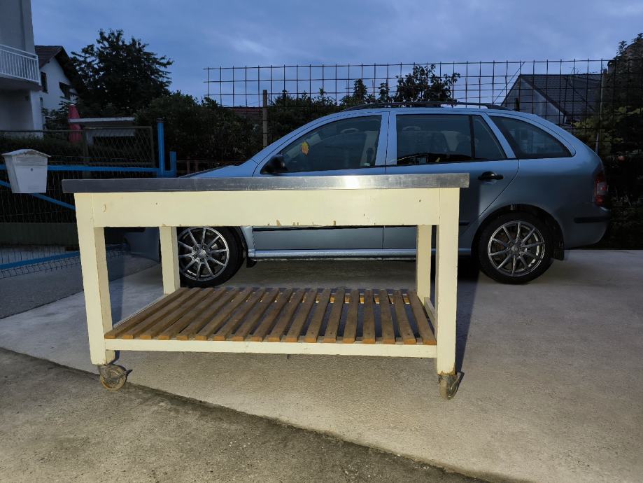 Prodajem stabilan i cvrsti drveni stol na kotacicima za mesariju ili nesto slicno sa donjom policom, radna ploha od inoxa, dimenzije DxŠxV 150x80x86cm