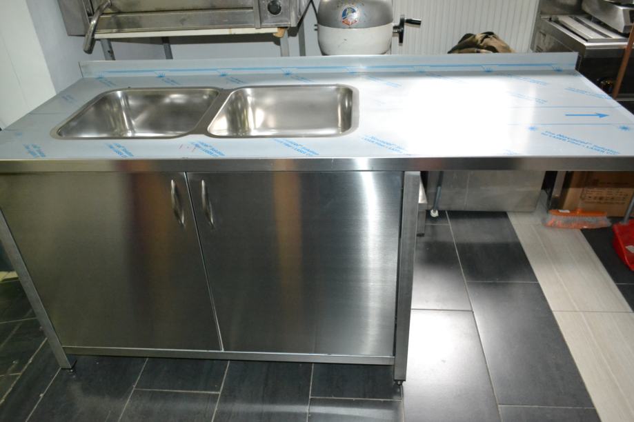 Kvalitetan i pojačan inox sudoper sa 2 korita lijevo,ispod zatvoren sa vratima,desno ocjeđivačka ploča i ispod prostor za perilicu