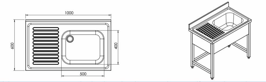 Sudoper 1 korito, 1000x600x850mmH, bez police, ocjedna ploha lijevo