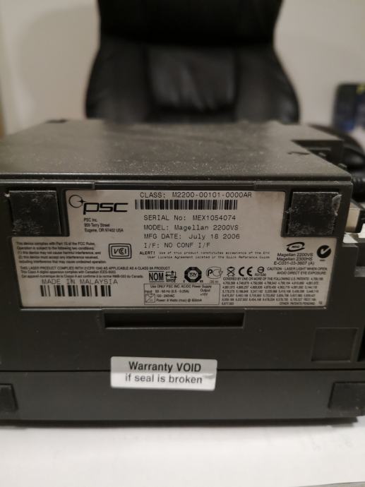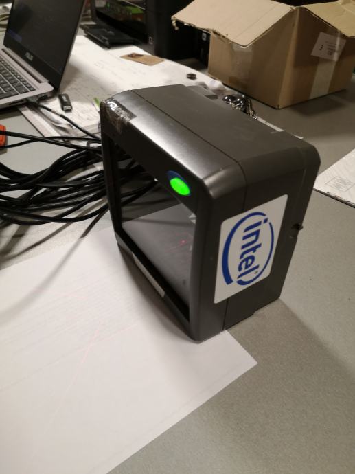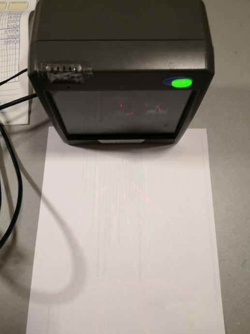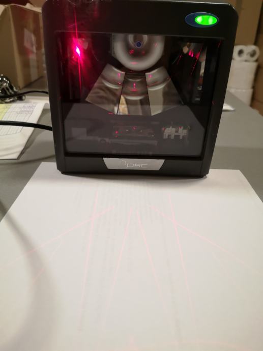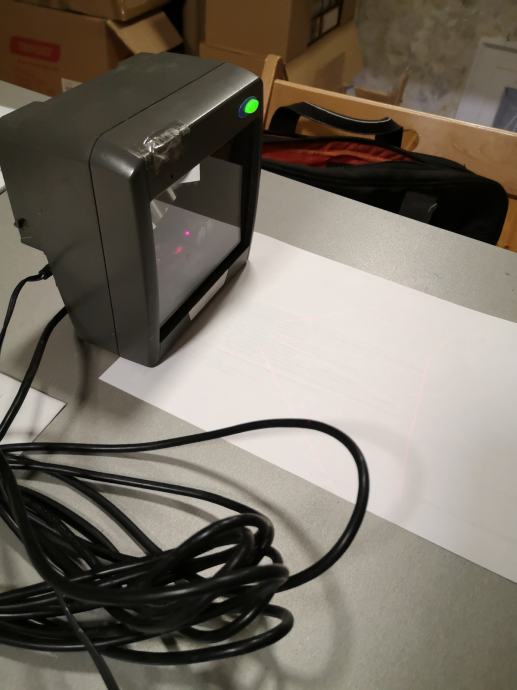 Bar code čitač omnidirectional, ovaj barkod čitač baca laser u svim smjerovima pa ne morate pozicionirati barkod artikla točno na jednu zraku kao kod konvencionalnih čitača, čitač je korišten ali ispravan i dolazi u kompletu sa ispravljačem i pripadajučim USB kabelom