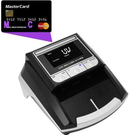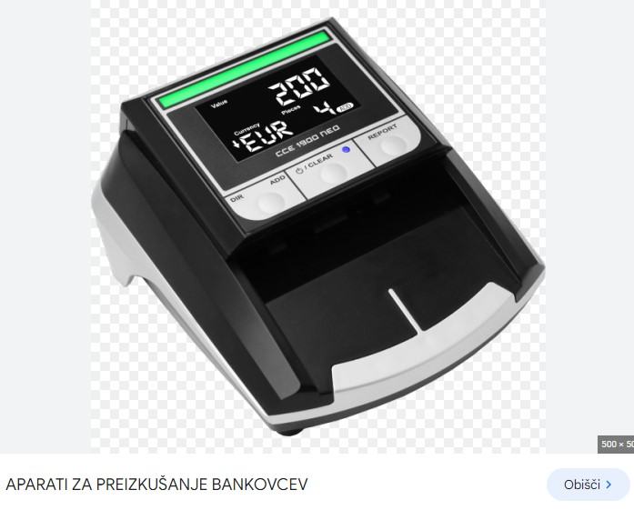 opis: CCE 1900 Neo Multi,V elektronski aparat lahko vstavljamo euro in usd bankovce obrnjene kakorkoli, ostale valute pa tako, da je prednja stran zgoraj. Aparat je na seznamu evropske centralne banke ECB, da 100% zanesljivo preveri avtentičnost zgornjih valut (uv lastnosti, velikost in avtentičnost papirja, magnetnost, infra rdeče znake in kosmiče in barvo. LED display šteje in sešteva vstavljene in preverjene bankovce. Če naleti na nepravi bankovec zapiska in ga izvrže. Napajanje s kablom na 220 V elektriko. Za posodobitve ob uvedbi novih bankovcev je vgrajena reža za sd kartico in micro usb izhod za bodoče nadgradnje. Možno je dokupiti baterijo za na teren, avto polnilec za uporabo v avtu, kabel ali sd kartico za buduče posodobitve.
