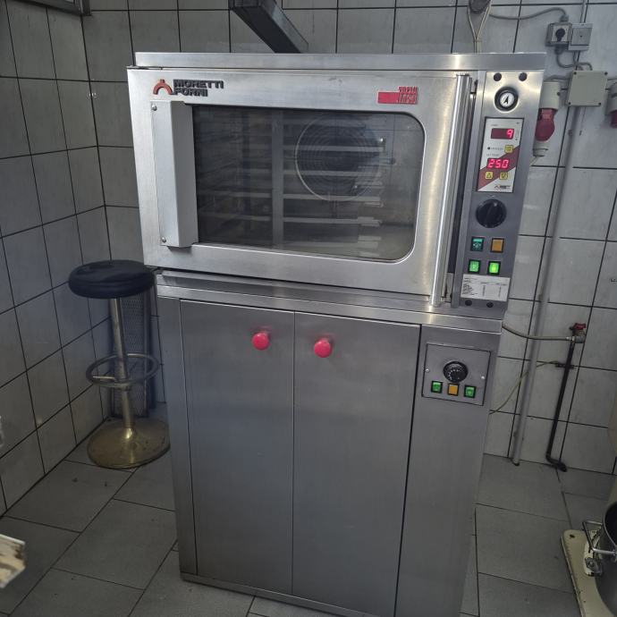 PRODAJEM POLOVNU KONVEKCIJSKU PEĆNICU MORETTI FORNI SA KOMOROM, PORED SU DVA KOLICA SA INOX LIMOVIMA 40x60cm, PRIKLJUČAK 380V, ISPRAVNO.