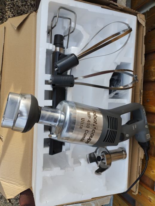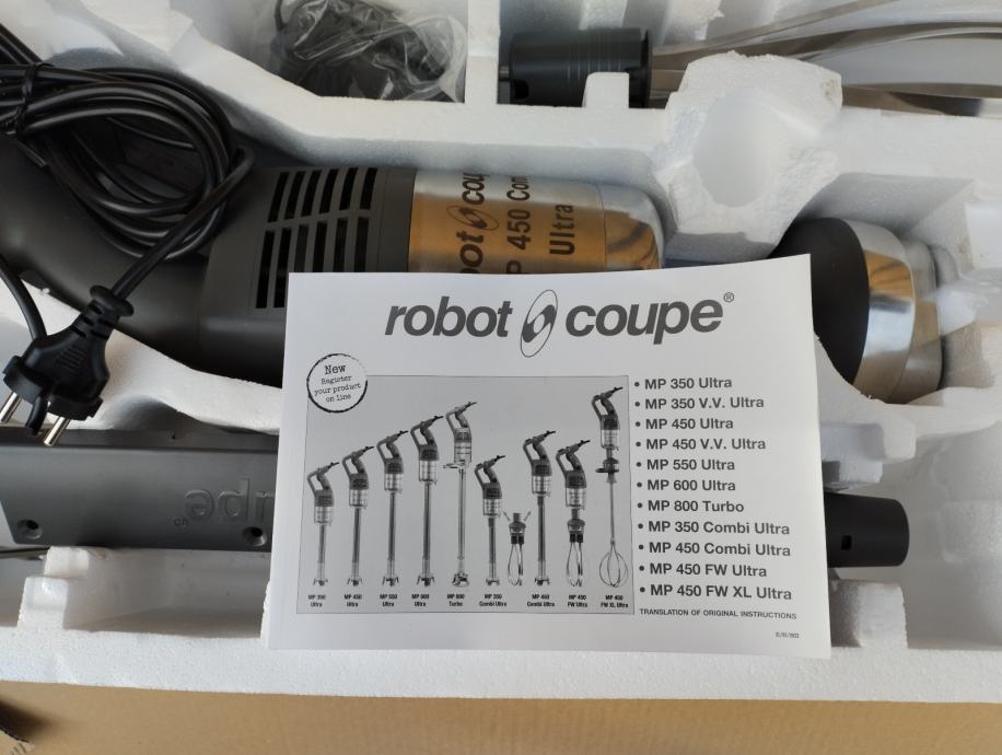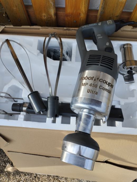 Prodajem novu štapnu mješalicu Robot Coupe MP 450 Combi Ultra EU. Radi se o profesionalnoj ugostiteljskoj opremi namijenjenoj zahtjevnoj komercijalnoj upotrebi. Uz glavni motor dolazi kompletna oprema uključujući štapni nastavak i žičani nastavak za mućenje. Napon napajanja je 220-240V/50-60Hz.