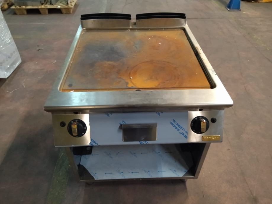 Radna ploha izrađena iz jednog komada od AISI 304 nehrđajućeg čelika 20/10 sa scotch brite završnom obradom. Radna površina sa zaobljenim prednjim rubom. Rubovi stranica pod pravim kutom za savršeno slaganje linije. Ploča roštilja debljine 16mm, čelična ravna sa zaobljenim uglovima, uvarena sa svih strana s nagibom prema ispustu u gornju plohu. Dimenzije aktivnog dijela ploče: 735x700mm. Ispust masnoće promjera 33mm. Velika posuda za masnoću kapaciteta 3 litre. Ispred radne ploče hladna zona dubine 75mm. Ergonomski oblikovan sustav upravljanja. Dvije nezavisne zone zagrijavanja. Podešavanje temperature u području 100° do 300°C. Svaka zona s dva štapna plamenika visoke energetske učinkovitosti s 4 reda plamena, ukupne snage 2x (2x5,5kW), izrađeni iz vatrootpornog inox lima. Paljenje preko pripalnog plamenika pomoću piezzo upaljača sa zaštitnom kapicom i ugrađene svjećice. Osiguranje od nekontroliranog istjecanja plina preko sigurnosnog ventila i ugrađenog termoelementa. Vanjske stranice izrađene od nehrđajućeg čelika sa scotch brite završnom obradom. Otvoreni ormarić za skladištenje posuda, tava, pladnjeva i sl. Noge izrađene od AISI 304 s regulacijom visine od 50mm. • Ukupna priključna snaga plina: 22,0kW