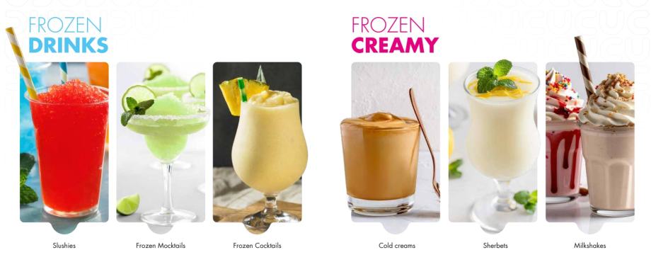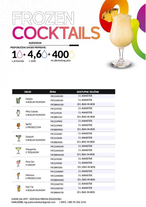 14 okusa slush sirupa u 3 pakiranja (2 L / 5 L / 10 L) = 42 artikla, plus 8 bezalkoholnih frozen koktela u 3 pakiranja = 24 artikla – sve u premium kvaliteti.