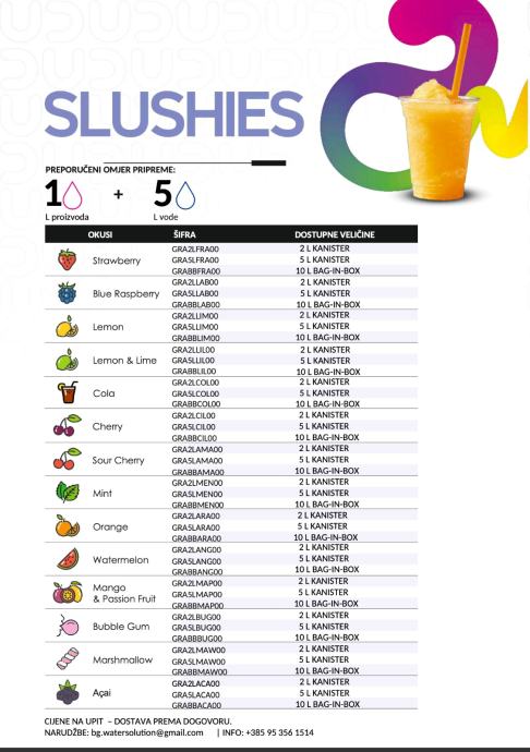 Prodajemo profesionalne koncentrate za slush (Made in Italy) – razvijeno za HoReCa i rad u profesionalnim slush aparatima: slush, carbonated slush, frozen drinks, frozen mocktails i frozen cocktails.