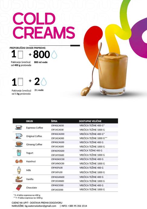 U ponudi imamo i cold coffee varijante koje se odlično prodaju: Espresso / Original / Ginseng – idealno kao frozen coffee / coffee granita / hladna krema (ovisno o aparatu i postavkama).