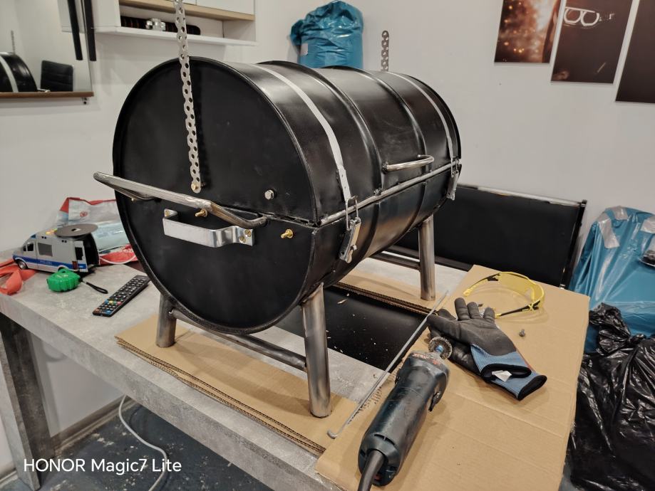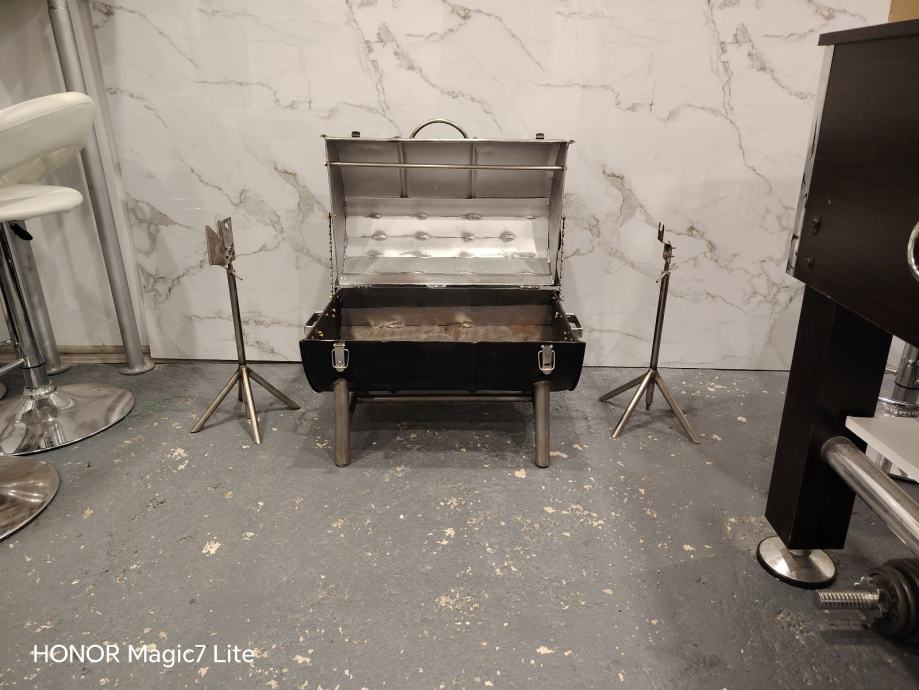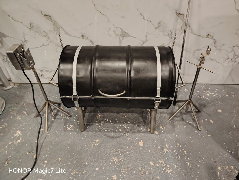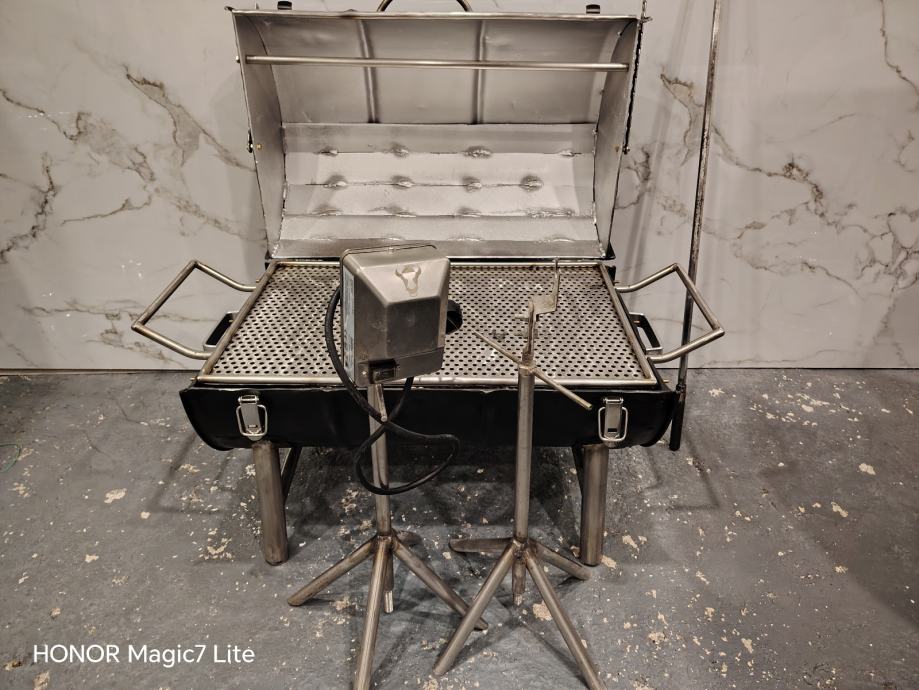 Ražanj+roštilj, pojačan kotlovskim limom 3mm,ručke aluminijske, postolje inox, plata za roštiljanje od prehrambenog inoxa ostalo industrijski, mogučnost prodaje sa motorom i dva nosača za ražanj ili bez toga, komplet sa slike 350e,bez motora i dva nosača 250€,molim upite preko poruka
