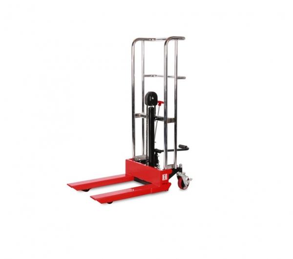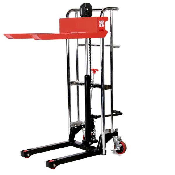 S transportnim kamionom s velikim podizanjem moguće je podići robu s maksimalnom ukupnom težinom od 400 kg do visine od 150 cm uz pomoć sklopive hidraulične nožne pumpe. Možete sami regulirati brzinu spuštanja pomoću hidrauličkog ventila. Kartonske kutije i druga roba lako se podižu, transportiraju i slažu na odvojivu platformu ovog paletnog kamiona. Međutim, ako vam treba paletni kamion, jednostavno odvojite platformu i pomaknite kratke palete vilicom. Vilica paletnog kamiona može se spustiti na oko 85 mm. Šasija ovog prijenosnog kamiona s velikim podizanjem posebno je robusna i ima dva rotirajuća kotača i fiksne kotače. Zaključavanje kotača viličara s velikim podizanjem osigurava veću stabilnost.