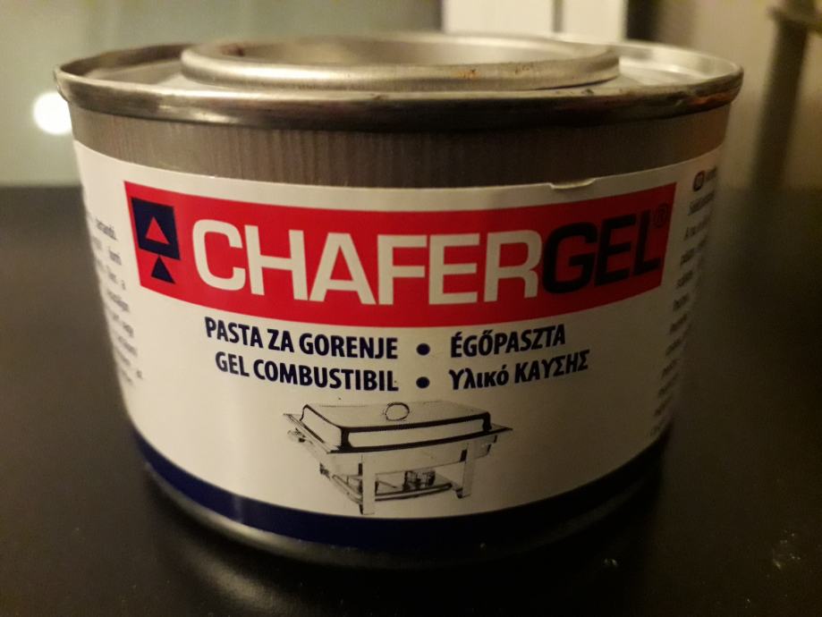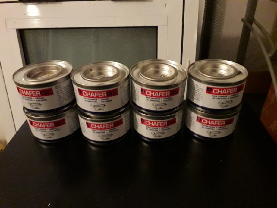 Ethanol gel, pasta za gorenje, grijač za posude, grijač za bain marie / chafing dish / banja maria, osam novih konzervi (pašteta), 200g konzerva 7€.