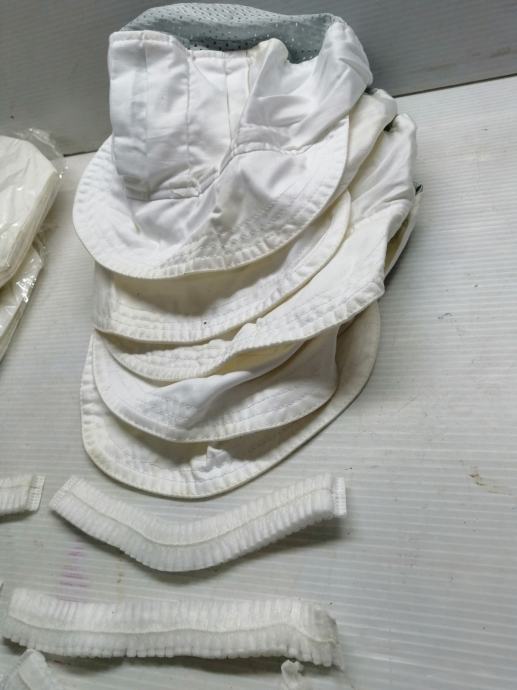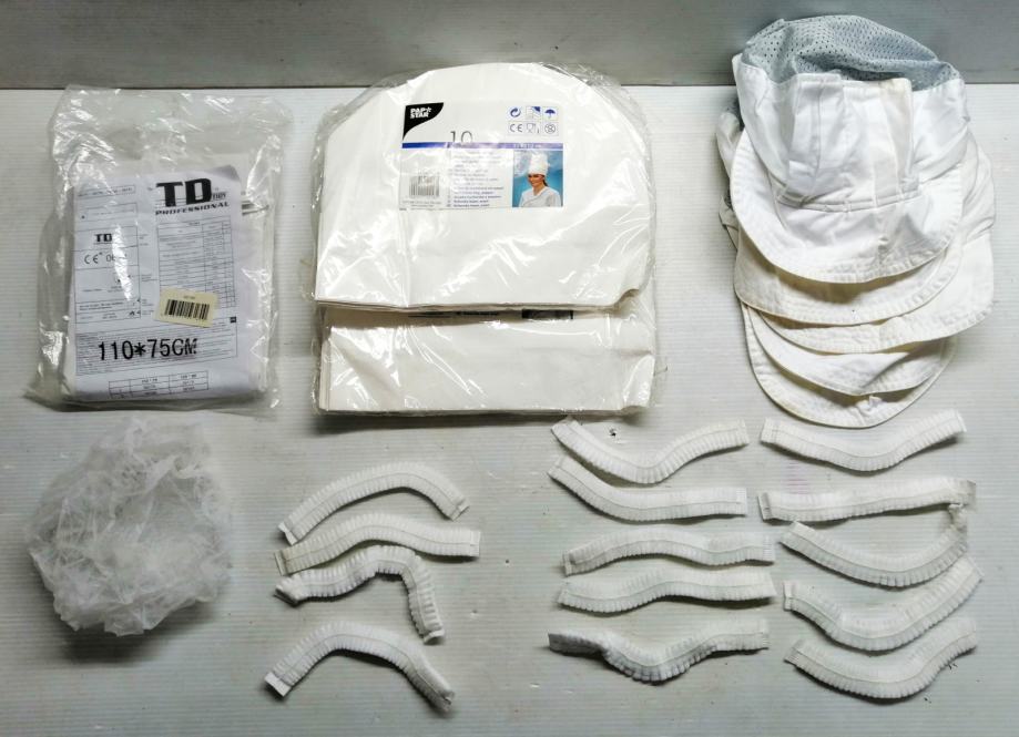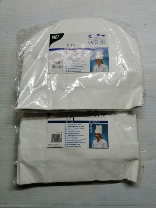 Kuharska, pekarska, slastičarska, radna kapa; slika 2 papirnata 2 x 10kom (novo) 5€, slika 3 i 4 mrežica (otvorena i neotvorene) 15kom (novo) 5€, slika 5 pamučna (korištena) 5kom 5€.