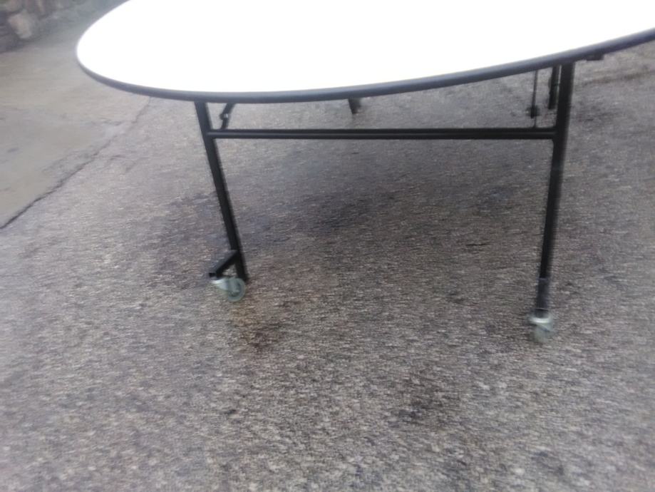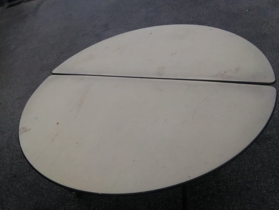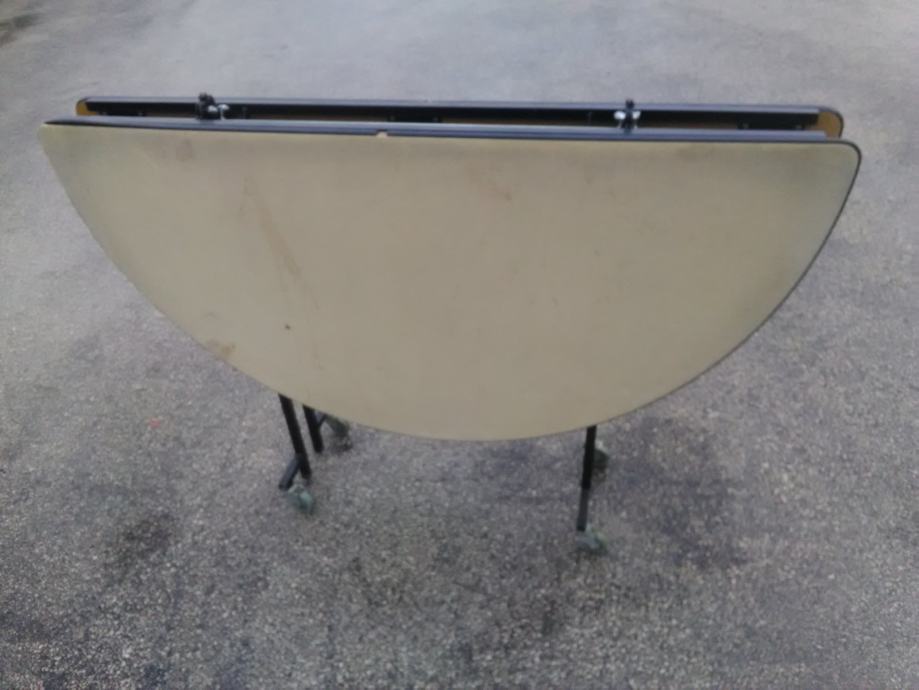 2 stola rasklopna okrugla na kotacima 180cm . sjedi komotno 10 osoba za stolom ispravni i u funkciji pogodni za restorane za feste , vjencanja i druga dogadanja a kad netreba spemite ih u skladiste ili garazu mozete i skinuti i ploce pa napravit kockasti stol ili radionicki stol konstrukcija tvornicki rad cvrsta i robusna za vise slika i informacija nazovite