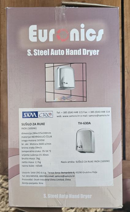 Prodaje se inox električno sušilo za ruke, model TH-630A. Radi na principu senzora pokreta.