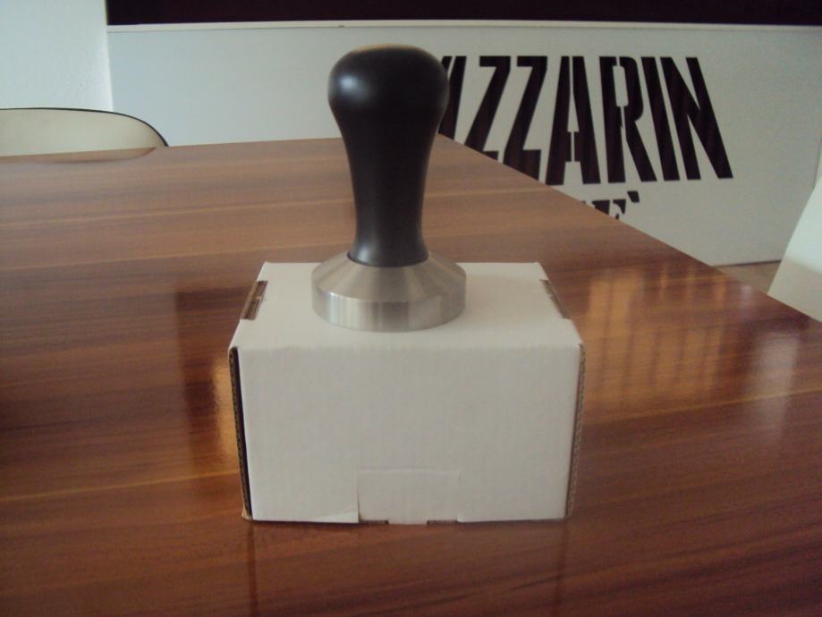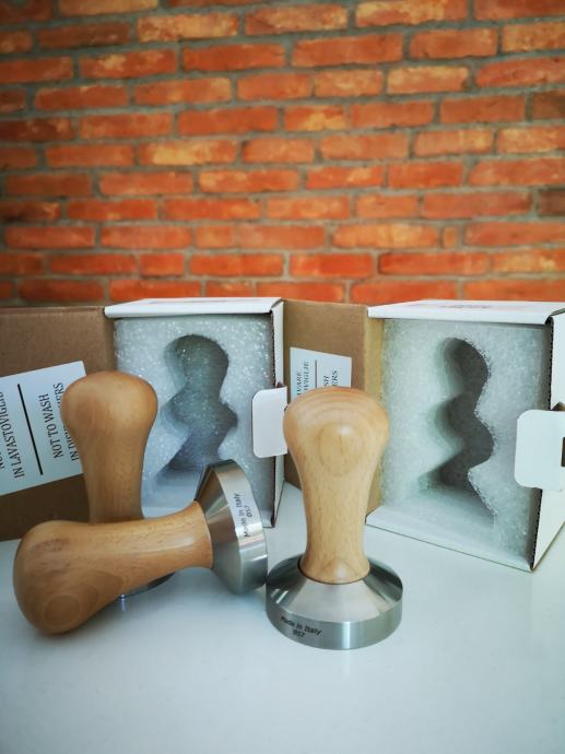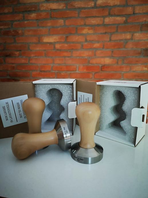 profesionalni tamper , donji dio je izrađen od inoxa sa ravnom podlogom za tampiranje sa promjerom od 58 mm , gornji dio je drveni,