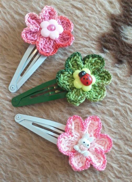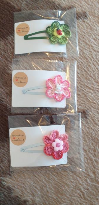 Špangice ukrašene kukičanim cvijetom i figuricom. Unikat, zapakiran da zadrži čistoću. Odmah su spremne za poklon. Poštarina besplatna.