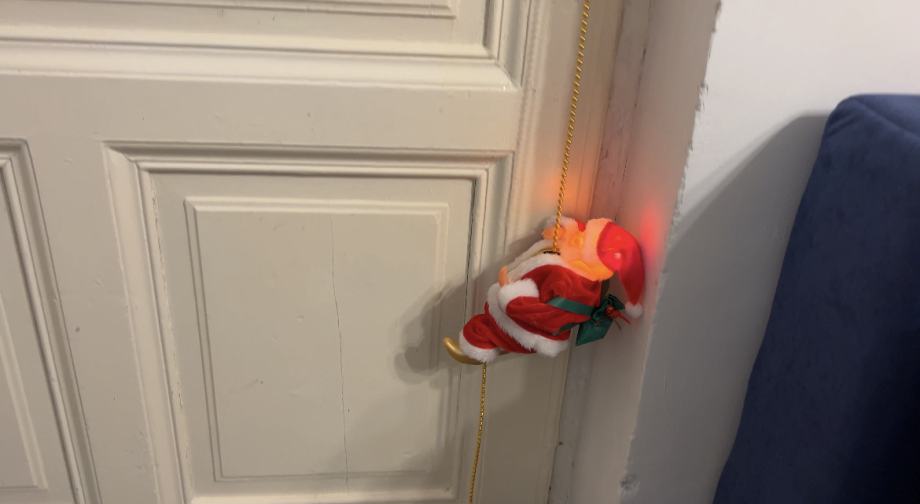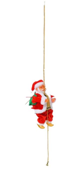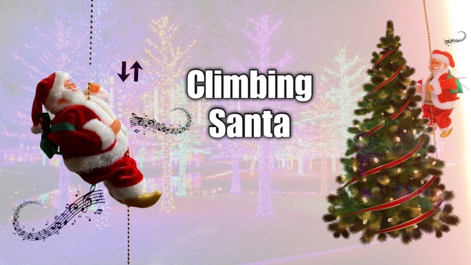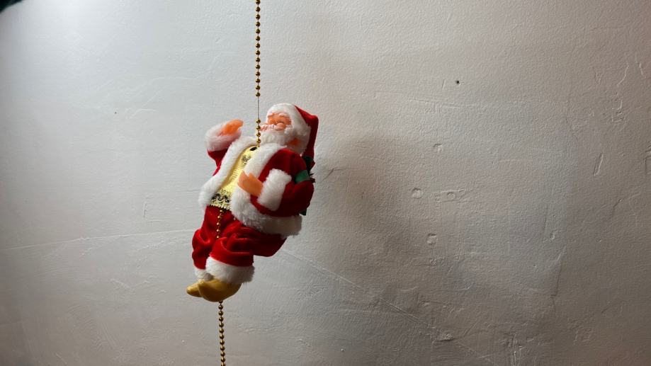 Djed Mraz koji se penje po uzetu gore dolje, svijetli i svira bozicne pjesme.