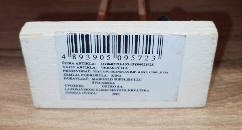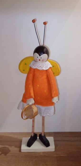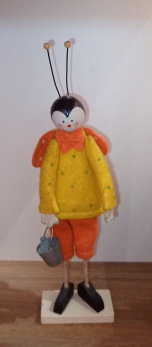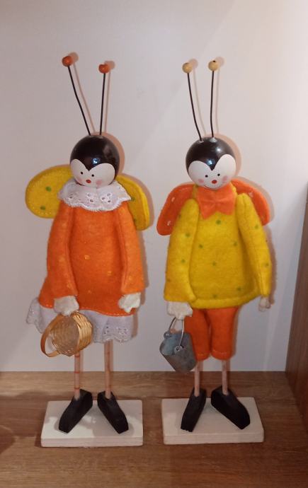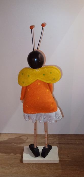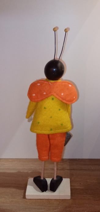 Ukras od drveta i tkanine koji prikazuje dvije pčele. Duljina ukrasa je 28 cm. Nije korišteno.