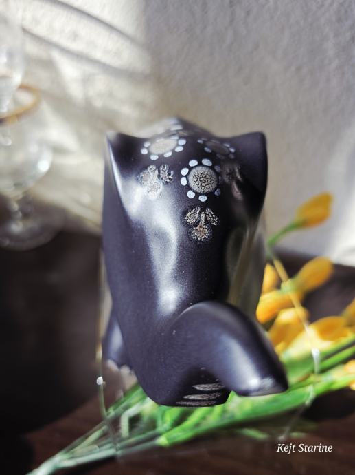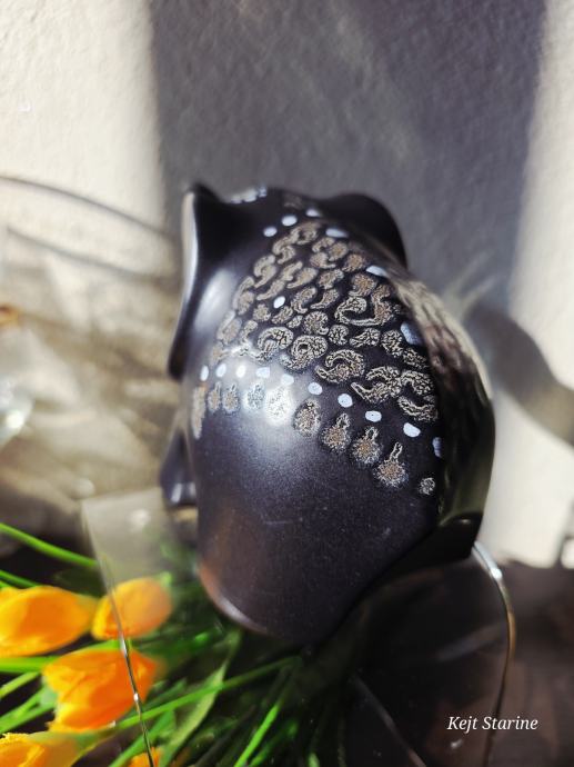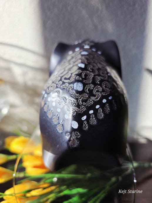 Figurica je crne boje s ukrasnim bijelim i smeđim detaljima.