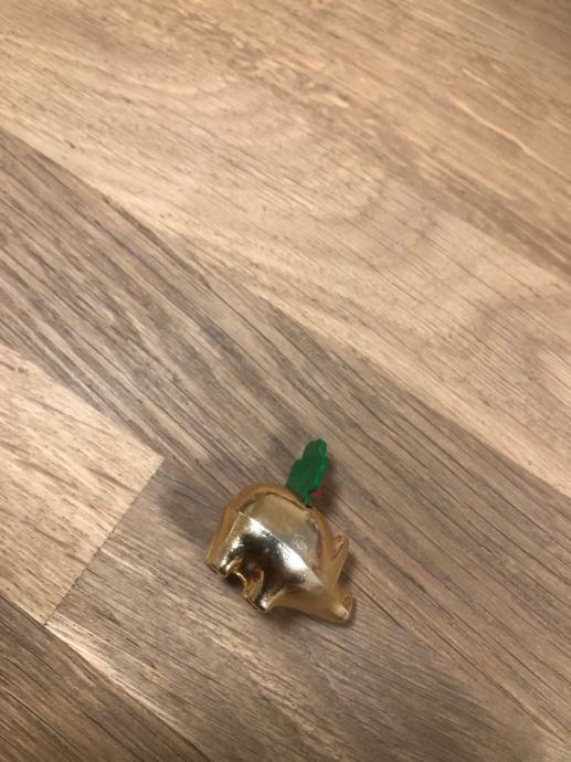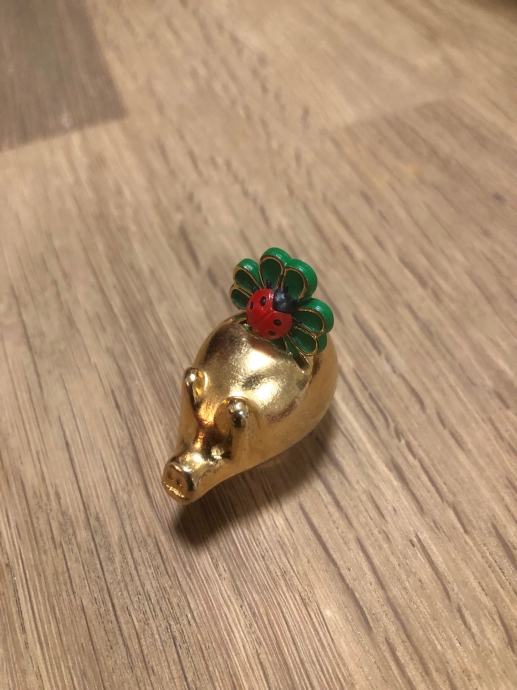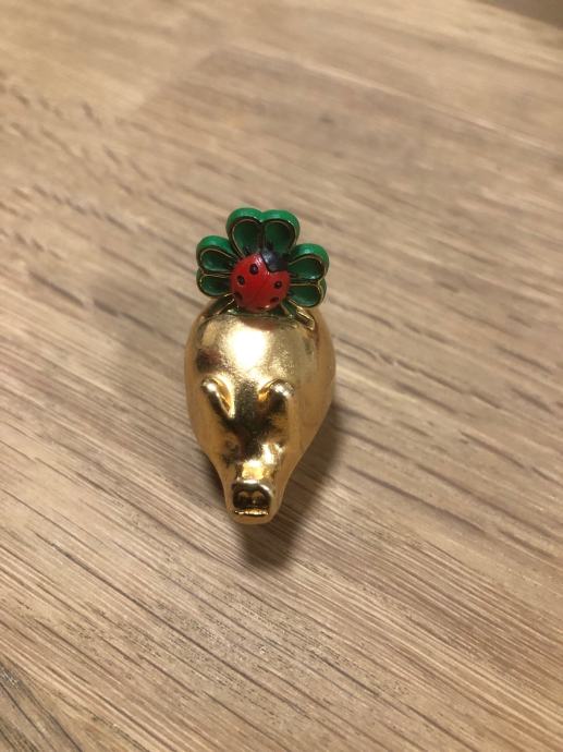 Prodajem prekrasnu, masivnu mesinganu figuricu u obliku kasice prasice sa simbolom sreće – metalnom bubamarom na zelenom emajliranom listu.