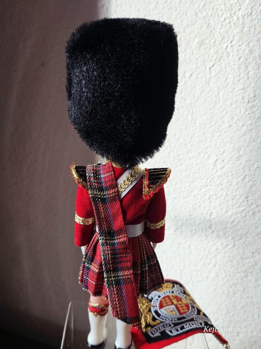 Lutka nosi karakterističnu crvenu tuniku, kilt s kariranim (tartan) uzorkom i visoku crnu kapu od medvjeđe kože.