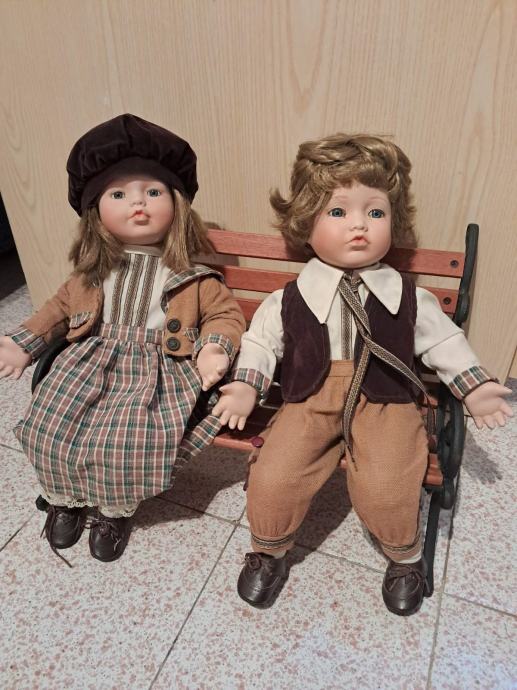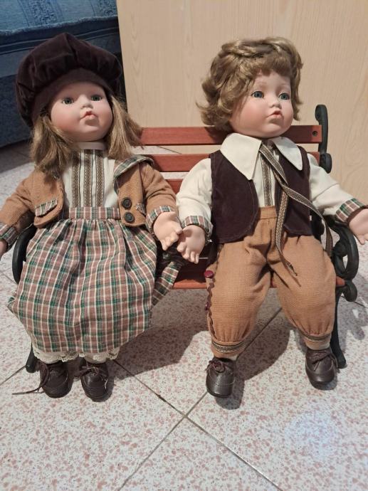 Prodajem izvrsno očuvane dekorativne porculanske lutke na masivnoj klupi. Dimenzije su cca 40 x 30 x 30 cm (mogu točno izmjeriti, po potrebi). Tijelo lutaka je platneno. Cijena 20 eura.