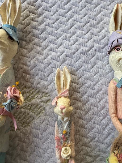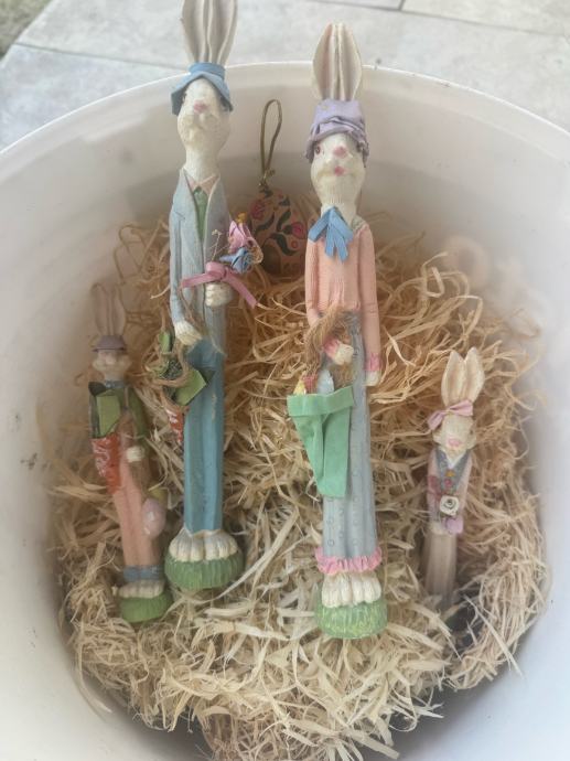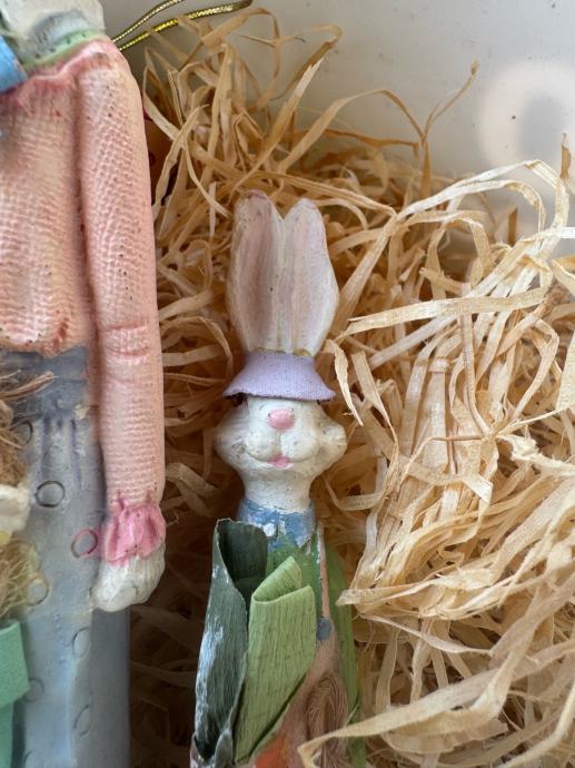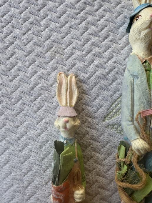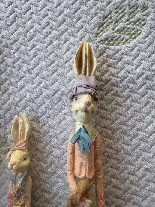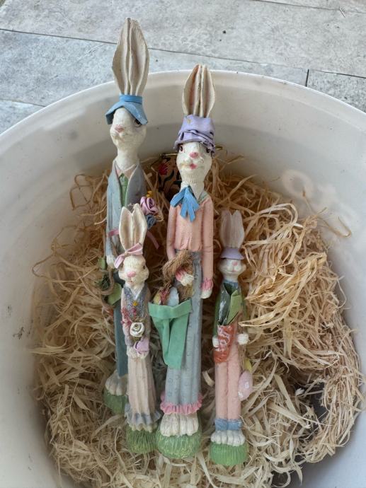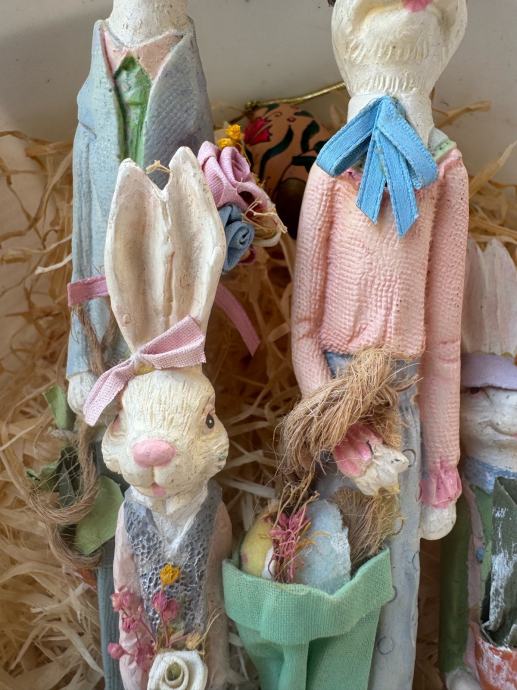 Prodajem set uskrsnih figurica Mr i Mrs Bunny, ukupno četiri komada. Radi se o visokim, uskim figuricama zečeva izrađenim u vintage stilu, ručno oslikanim u nježnim pastelnim tonovima zelene, plave, ružičaste i ljubičaste boje. Svaka figurica ima karakteristične dugačke uši i odjevena je u sitno detaljiziranu odjeću s dodacima poput šešira, marama i cvjetića. Dvije veće figurice predstavljaju odrasli par, a dvije manje djecu, pa zajedno čine kompletnu obitelj. Figurice su rustikalnog, vintage izgleda s teksturiranom površinom koja imitira ručnu izradu. Lijepa dekoracija za dom za blagdansko uskrsno uređenje.
