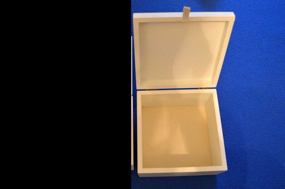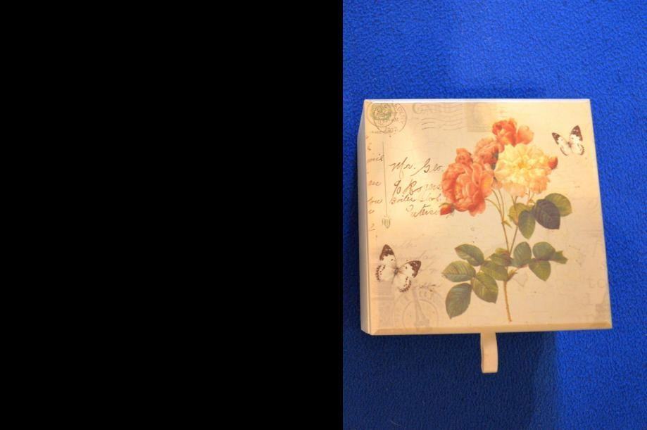 1 drvena kutija decoupage stila. Nije domaća izrada već su takva kupljena. Nema ostecenja. Dimenzija je 17,5 x 17,5 x 10 cm.