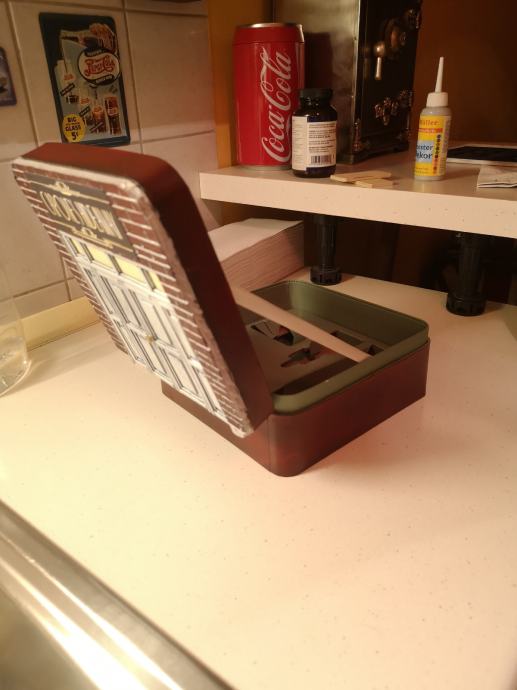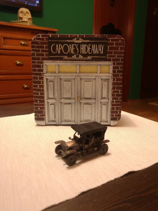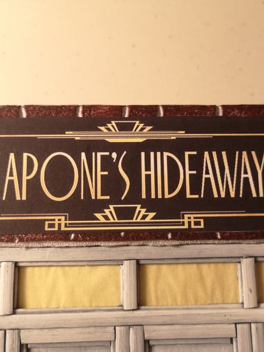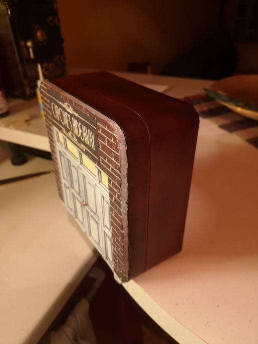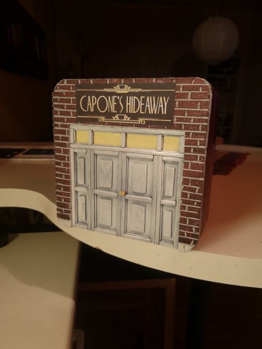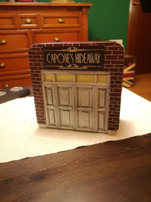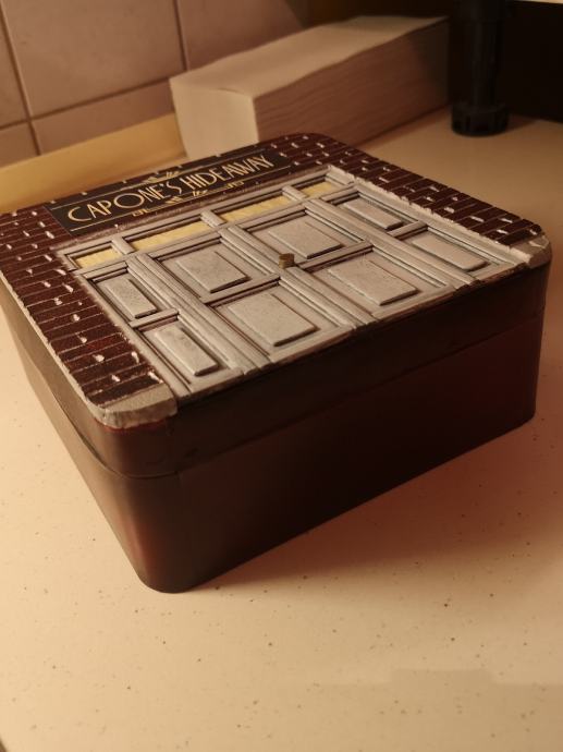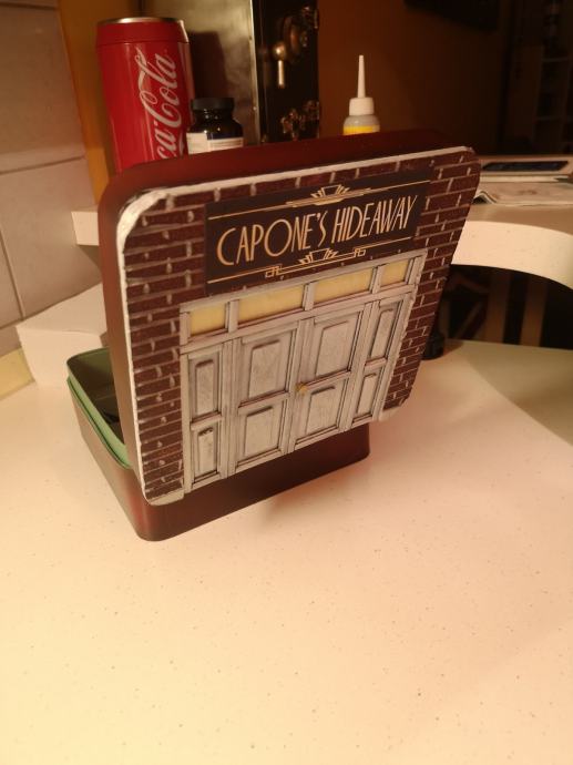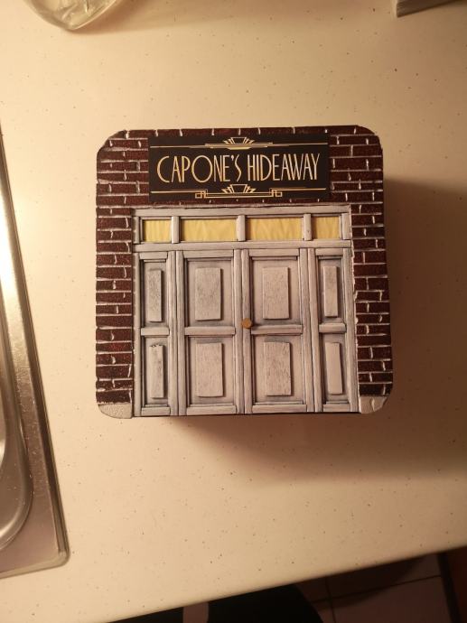 Dimenzije 20 x 20 x 8 cm. Čvrsta kartonska kutija, ručno rađena drvena vrata, akrilne boje, unikat, Capone, club, bar iz vremena prohibicije. Ukrasna kutija. Ne šaljem pouzećem