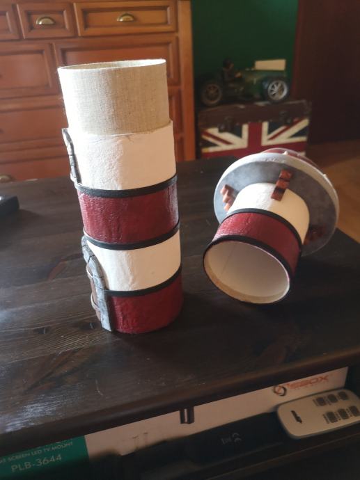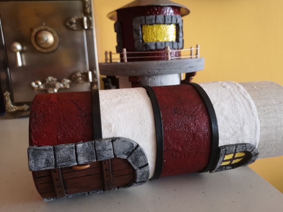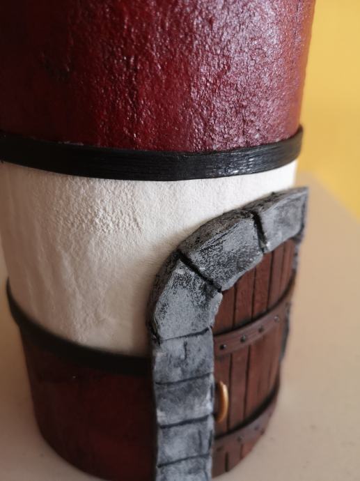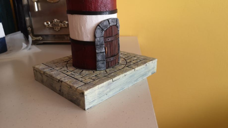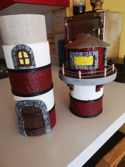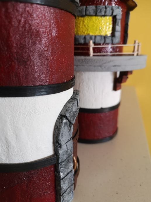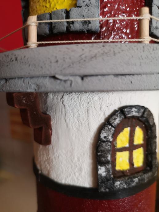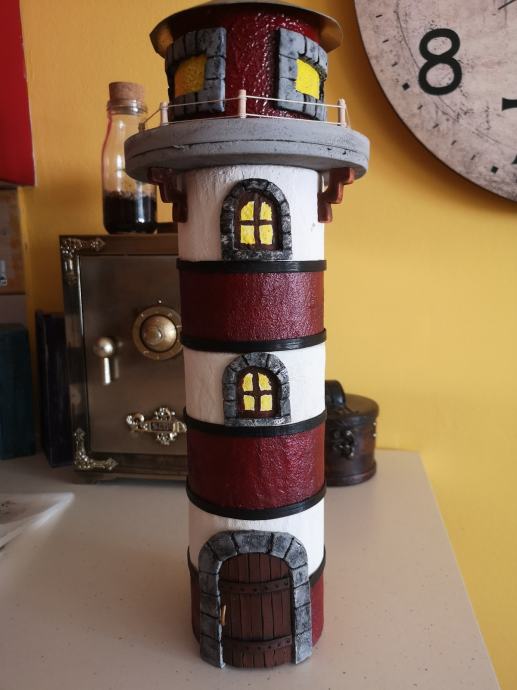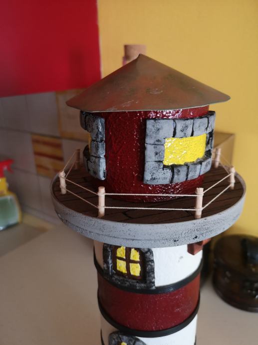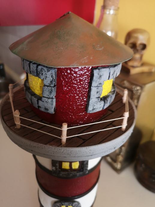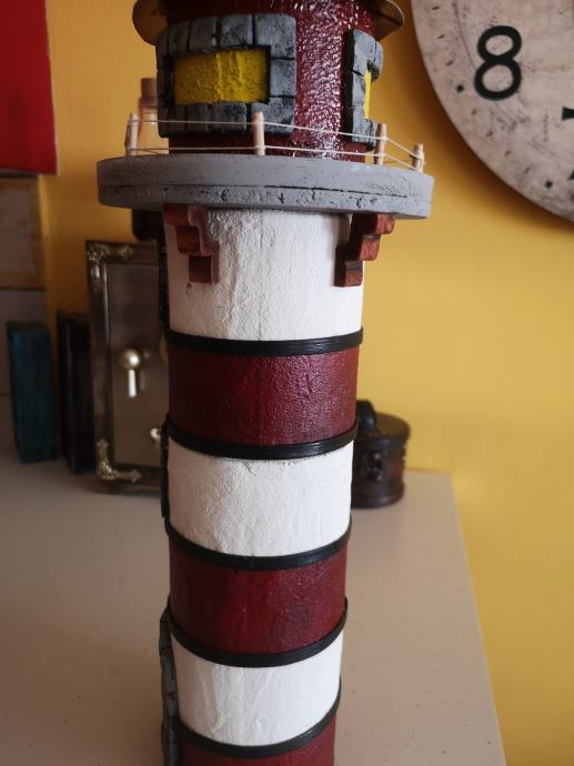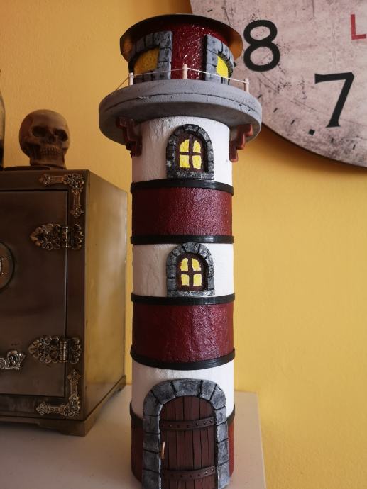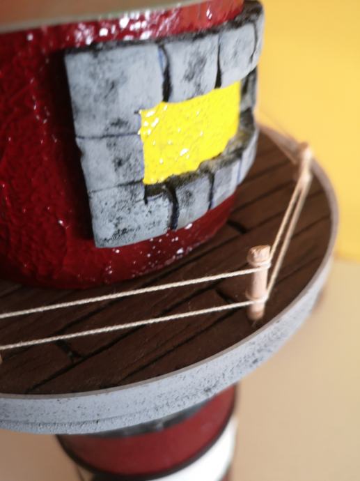 Svjetionik, ručni rad, unikat, v ukupno 41 cm, spremnik v 30 cm. fi baze 9 cm, može poslužiti kao spremnik za dragocijenosti, poklon, kutija za butelju... Po želji sa postoljem, drvena kutija 20 x 17 x 3 cm, dodatnih 5 €. Ne šaljem pouzećem