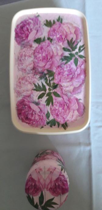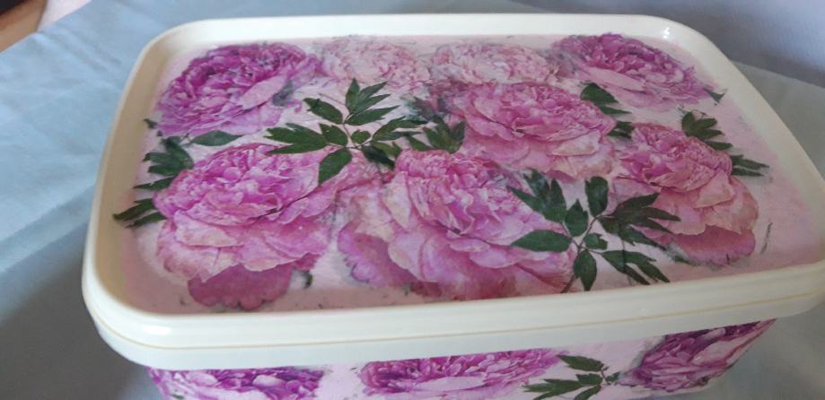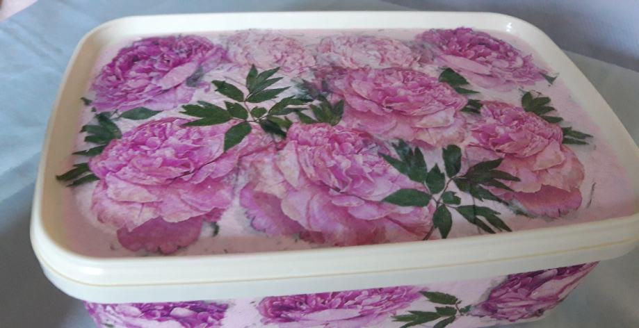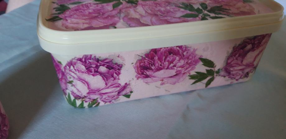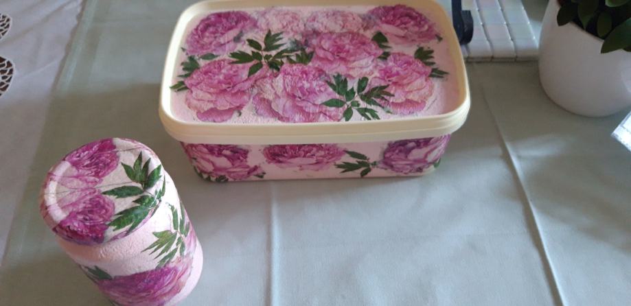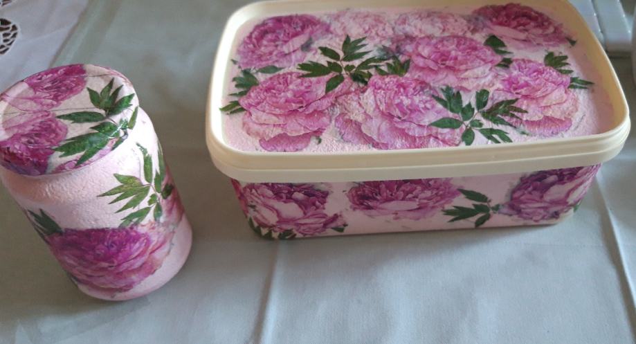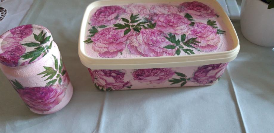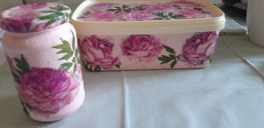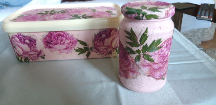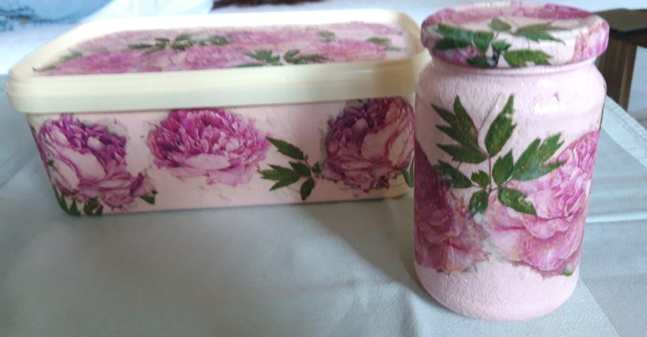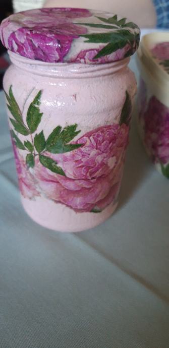 Kutija za pohranu i staklenka, ukrašene dekupaž tehnikom.