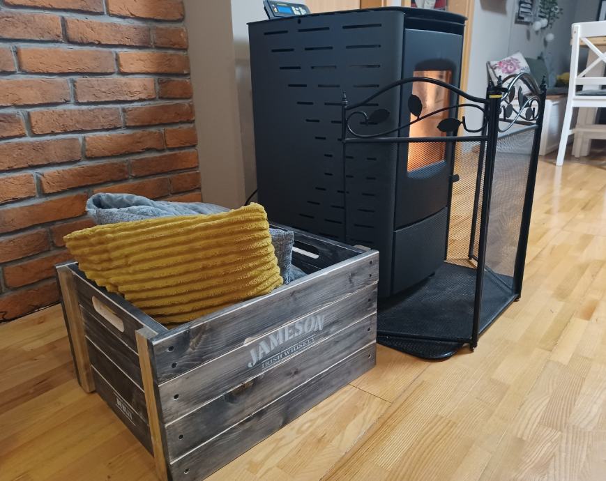 Ručno rađena kutija za spremanje, drvo jelovine, bojano i s otiskom. Dimenzije 50x42, visina 28 cm.
