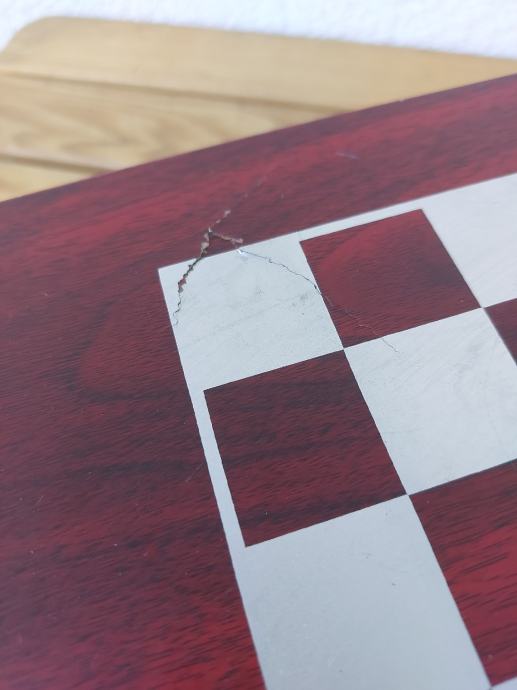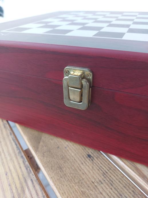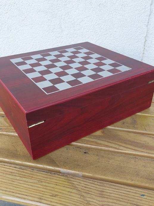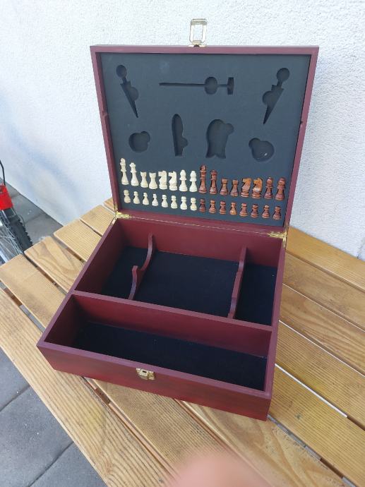 Velika drvena kutija za 3 boce sa kompletom šahovskih figura. Drvene figure za šah. Na jednom mjestu malo oštećena, vidljivo na zadnjoj slici. Dimenzije 36 x 31,5 x v 12,5 cm. Ne šaljem pouzećem