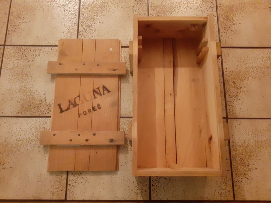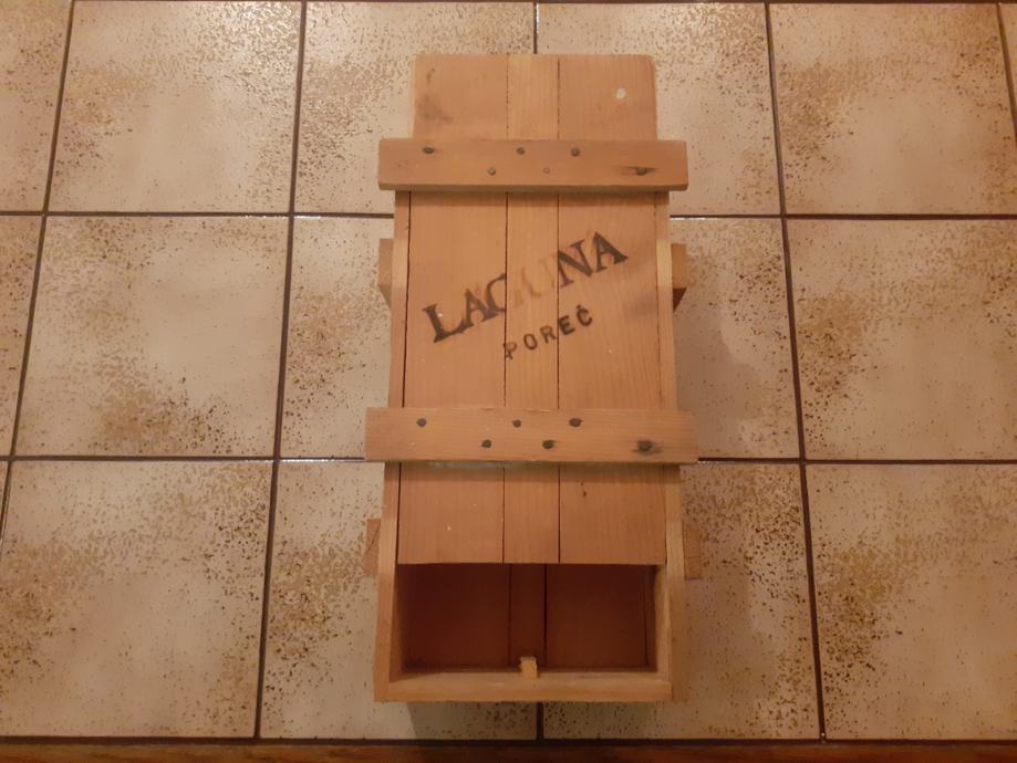 Prodajem drvenu kutiju za ukras/poklon/vino - Laguna Poreč. Nažalost ne znam koliko je točno stara, ali sigurno je 20+ godina. Kutija je u vrlo dobrom stanju, pogotovo s obzirom na starost, sve vidljivo na slikama. Dimenzije kutije su: 36 cm x 20,5 cm, dok je debljina 12,5 cm. Kutija je ručni rad, a napravio ju je Željko Dukić iz Delnica.