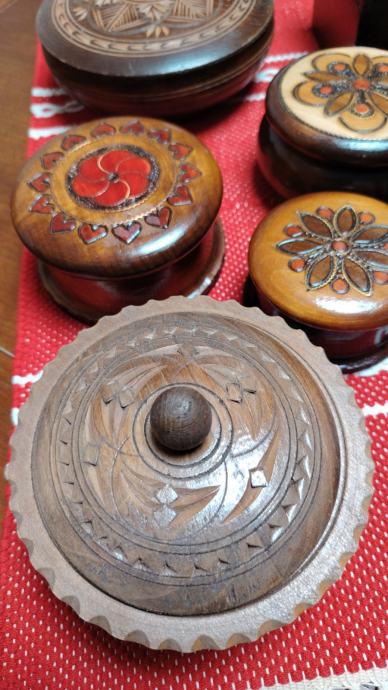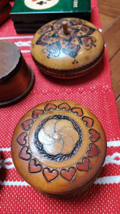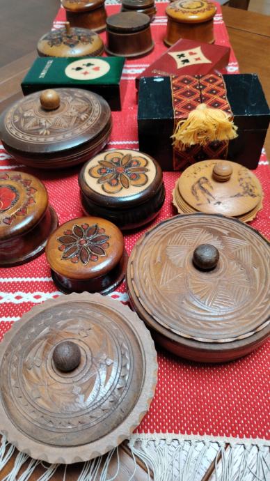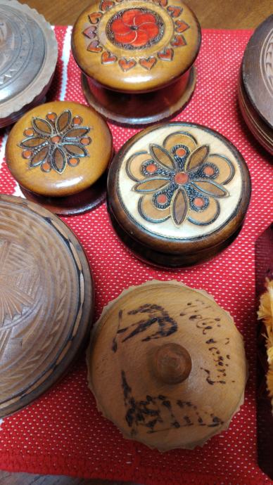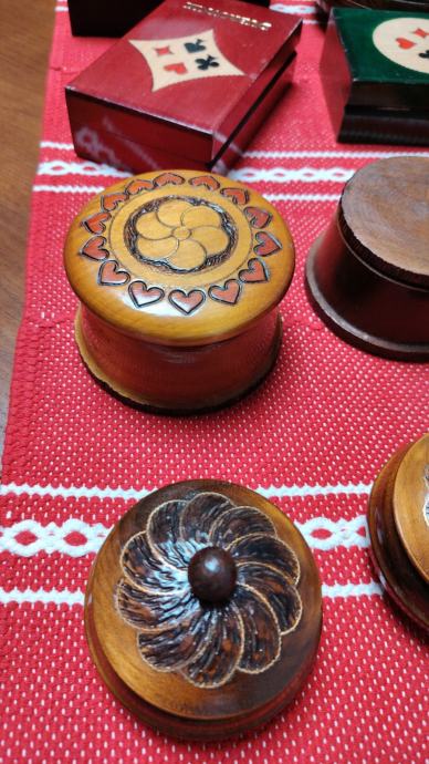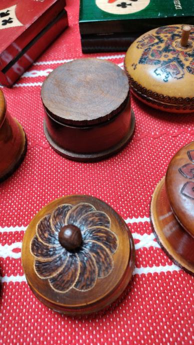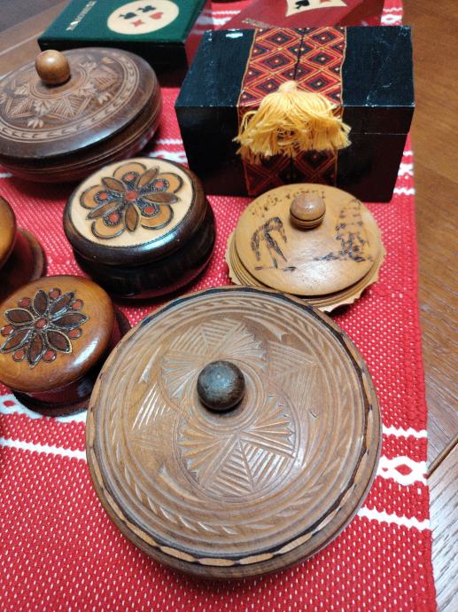 Drvene stare kutije, tokarene, rezbarene, neke ukrašavane bojom pa lakirane. Za čuvanje sitnih stvari i nakita. Neke korištene, neke nisu korištene.Cijena za 1 komad 3,00 eura.