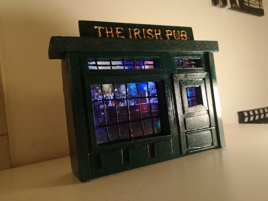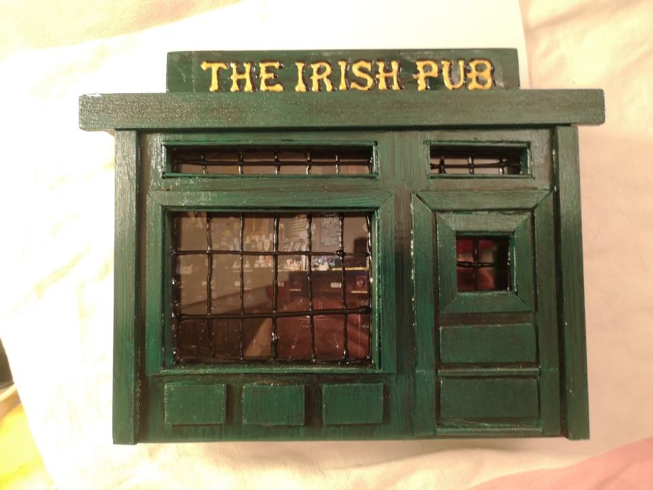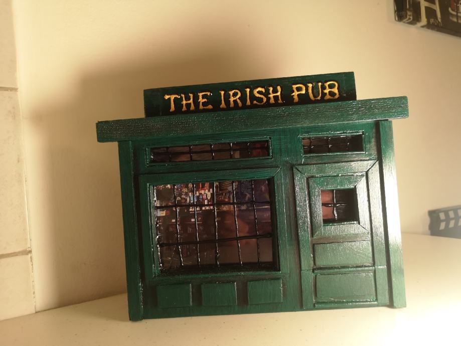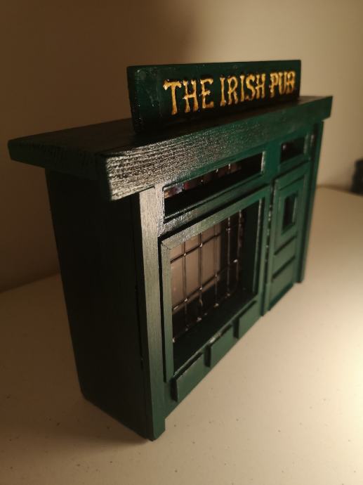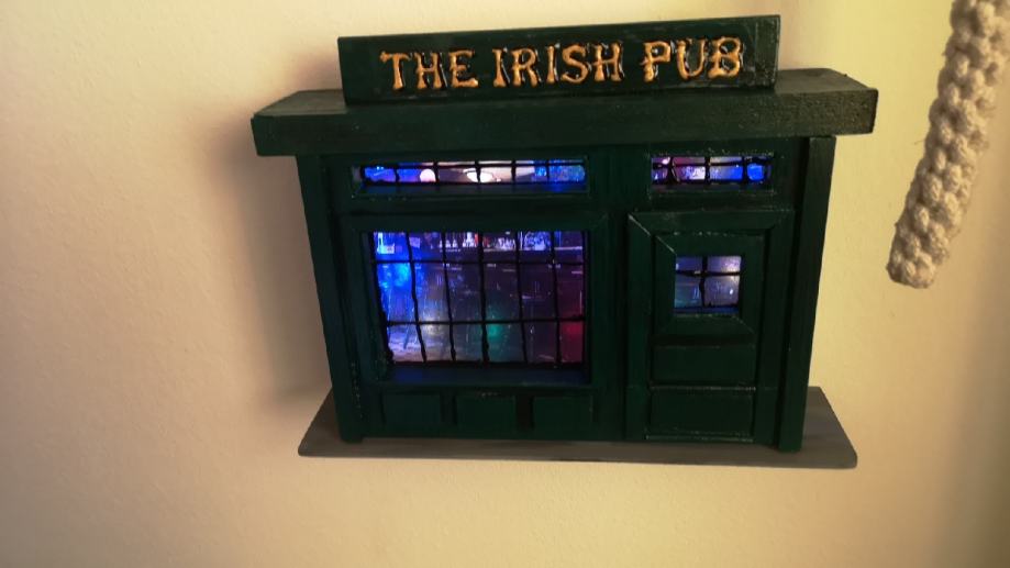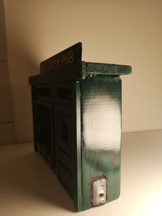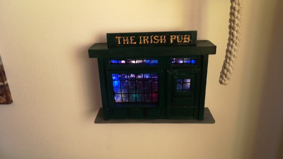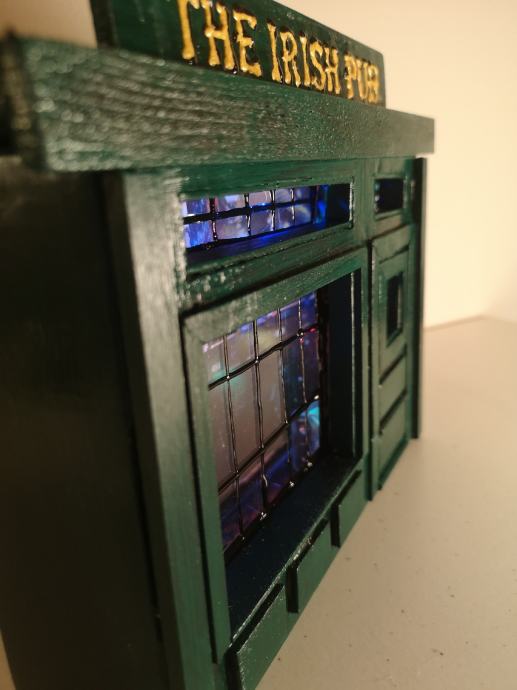 Ukrasna kutija, the irish pub, karton/drvo/staklo, sa led osvjetljenjem, dvije AA baterije, akrilne boje, ručni rad, unikat, svjetleća dekoracija za dom ili kafić, pub, može se staviti na zid ili kao samostojeća. Dimenzije ukupno 26 x 20 x 6 cm, sama kutija 23 x 16 x 6 cm. Ne šaljem pouzećem