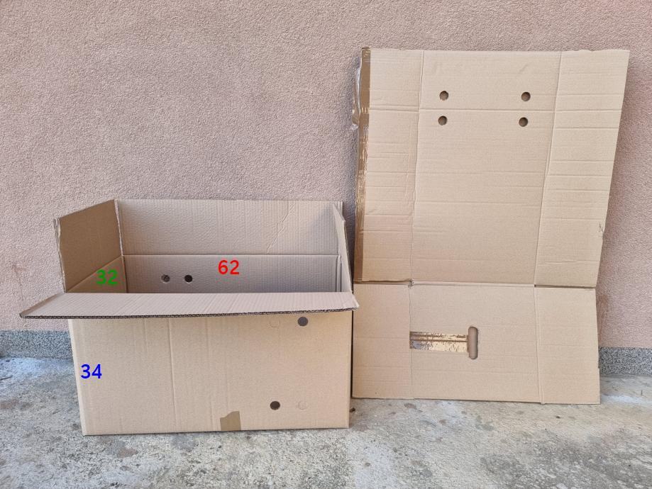 Kartonska kutija vrlo čvrsta,za više namjena,teže predmete upakirat,kod selidbe,dimenzija 62x34x32 cm,upotrebljene jedanput, čiste su ! Inače služe za pakiranje ukupno 360 komada kokošjih JAJA!