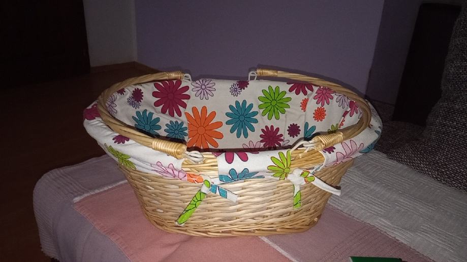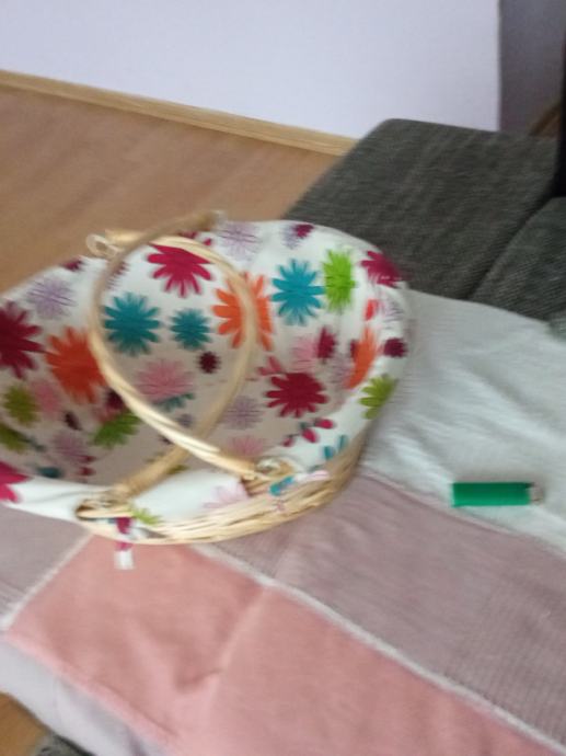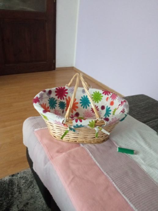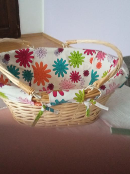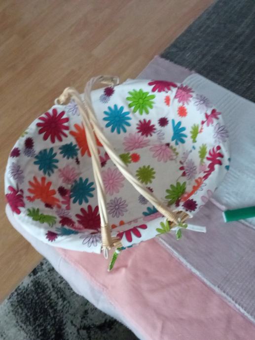 Nova,prekrasna košara s ručkama koje se mogu polegnuti do samog ruba,te su kao obruč oko košare.Može se platno skinuti i oprati.dimenz.41cm x 33,dubina 15cm