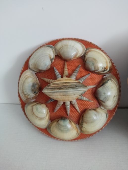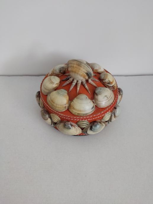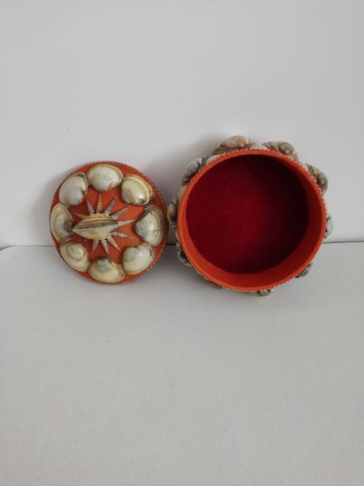 Vintage kutija za sitnice. Optočena školjkama, podstavljena baršunom. Promjer 16 cm.