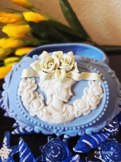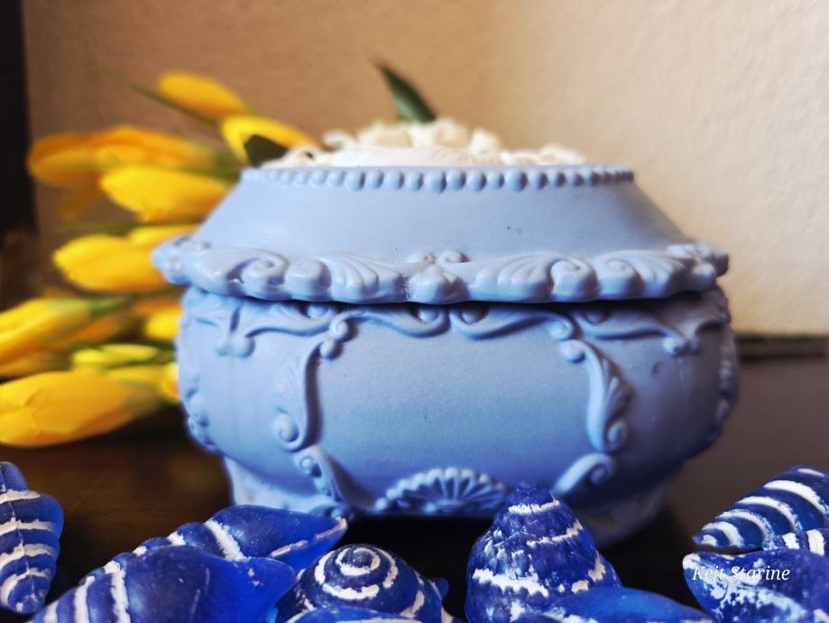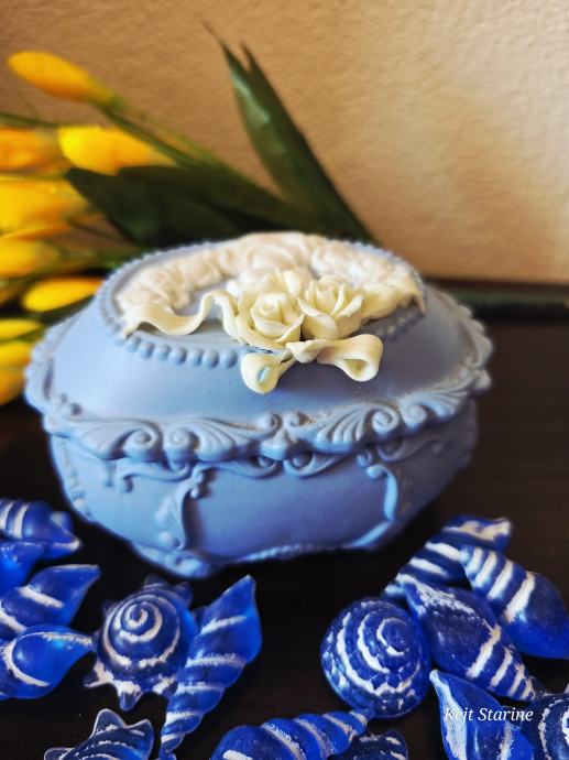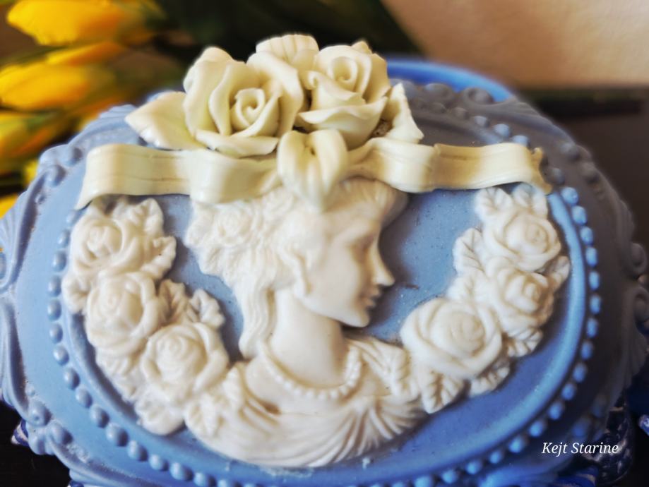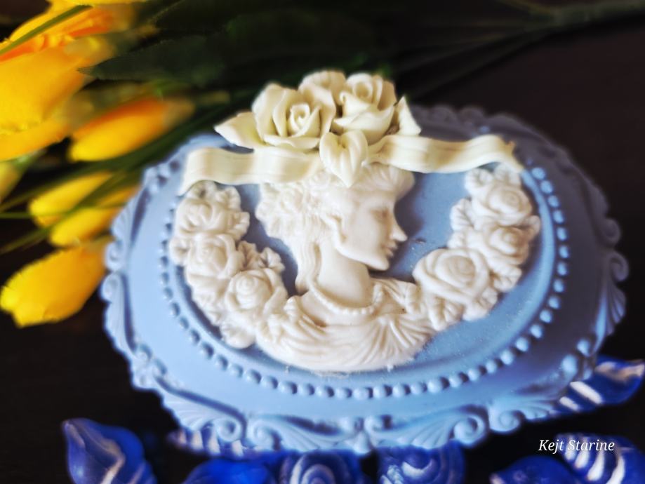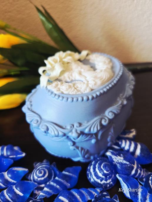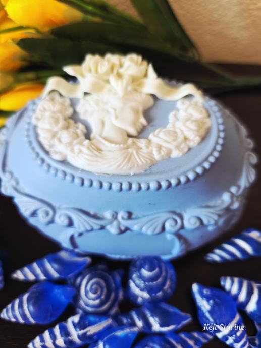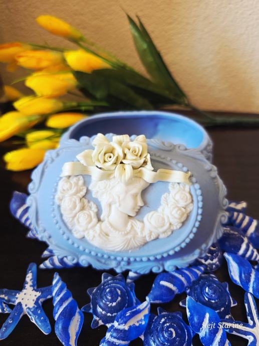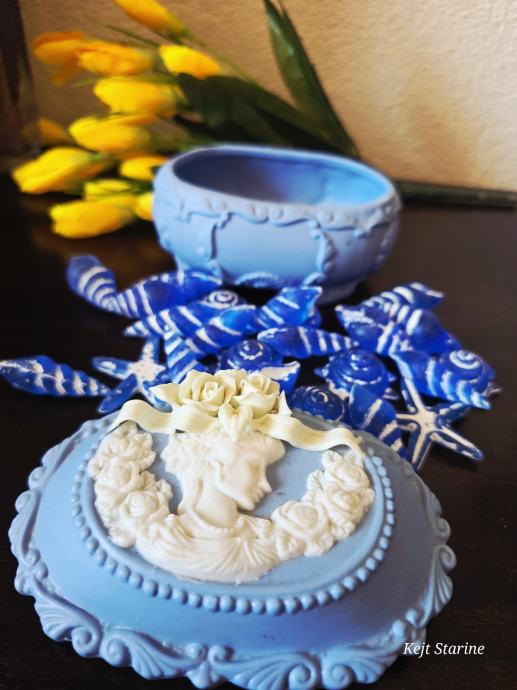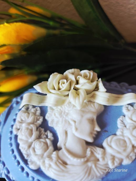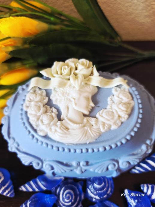Na slici je prikazana kutija za nakit s plavom bazom i reljefnim ukrasima boje bjelokosti, uključujući ženski profil i cvjetne motive.