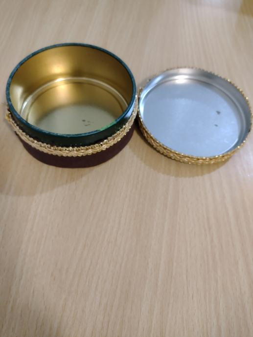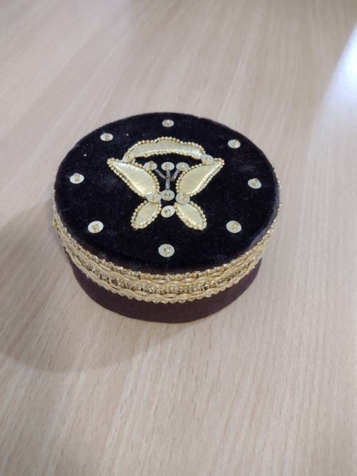 Prodajem ukrasnu kutijicu za nakit ručno izrađenu tehnikom zlatoveza zlatnim koncem, smeđa, 10 cm promjera.