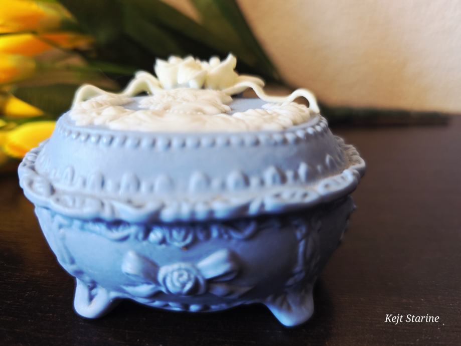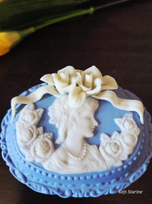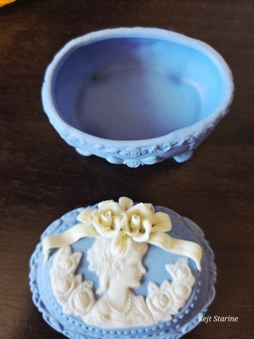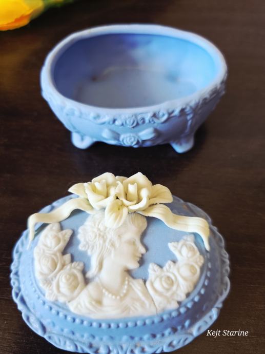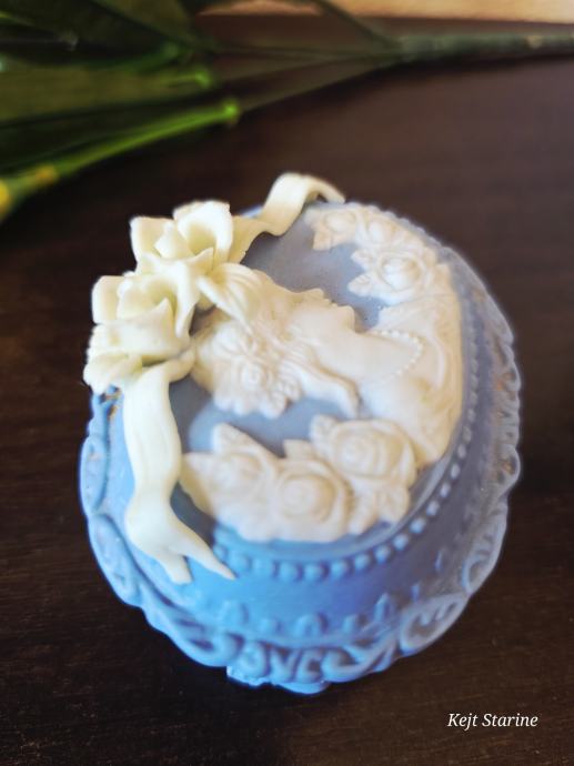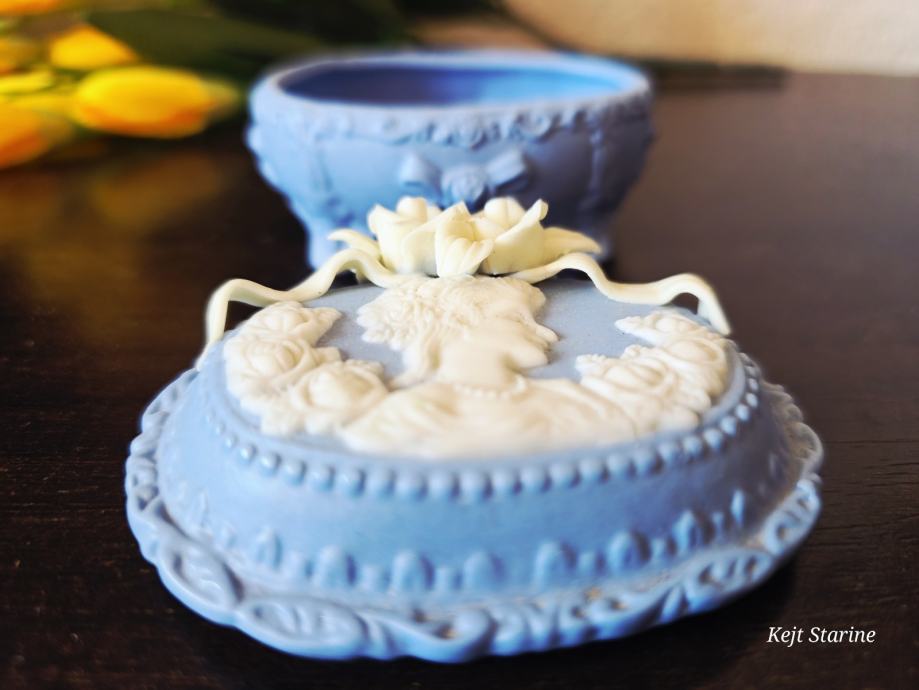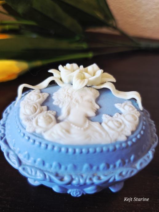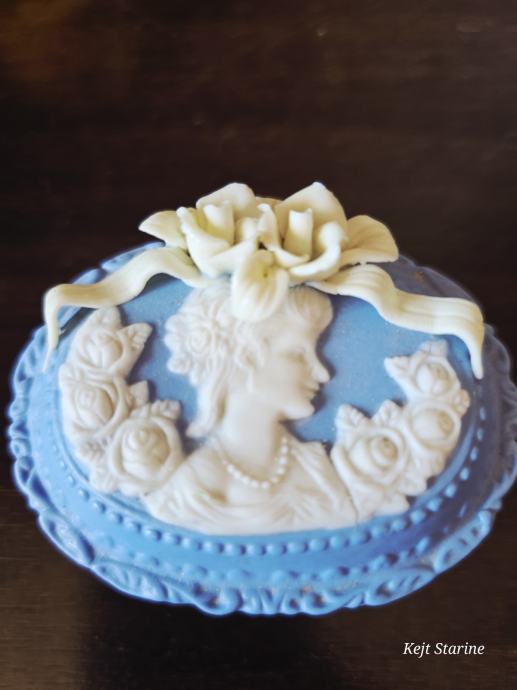 Na slici je prikazana kutija za nakit s plavom bazom i reljefnim ukrasima boje bjelokosti, uključujući ženski profil i cvjetne motive.