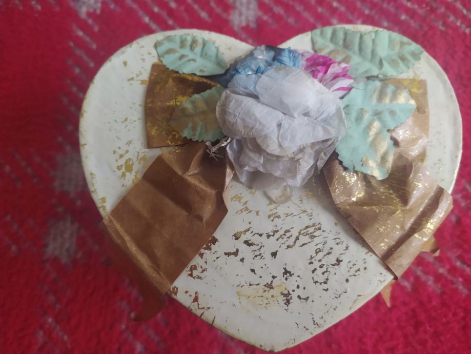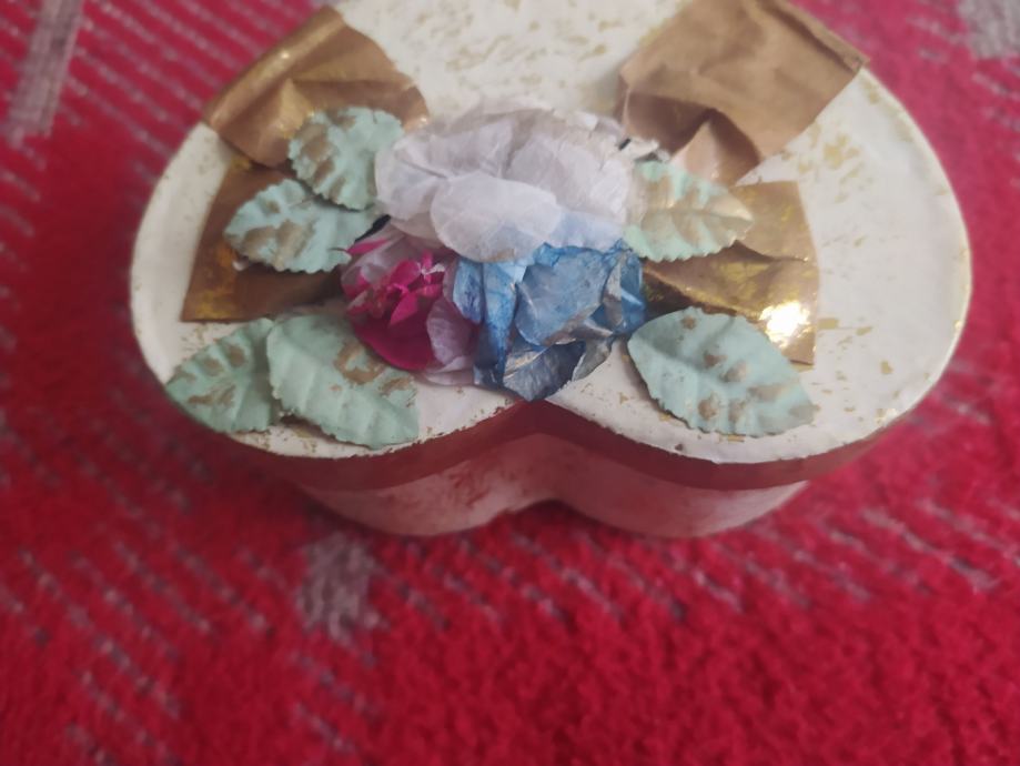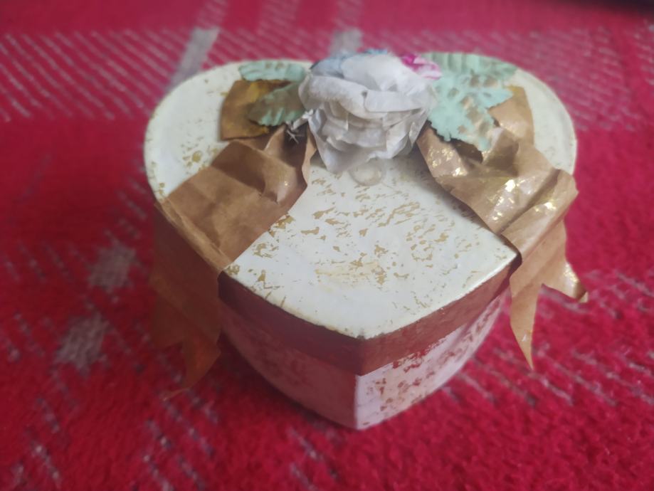 Kutijica za poklon u obliku srca, bež zlatnaste boje s ukrasnom vrpcom na poklopcu. Odlično stanje, jako kvalitetna izrada, čvrsta robusna kartonska kutija nadprosječne kvalitete (nije neka loša mekana savitljiva). Dimenzija kutijice je 12x9cm i visine 7cm. Idealno za poklon dragoj osobi za božić, blagdane i sl.