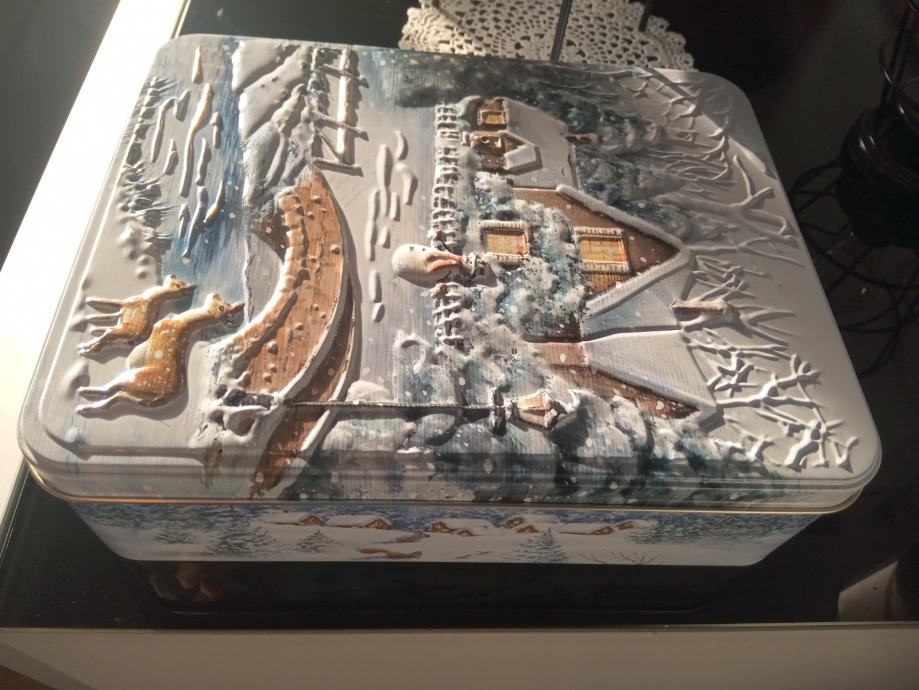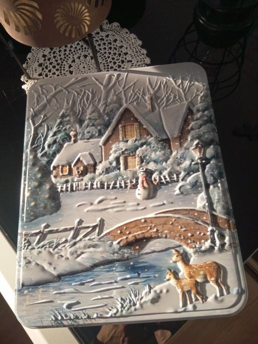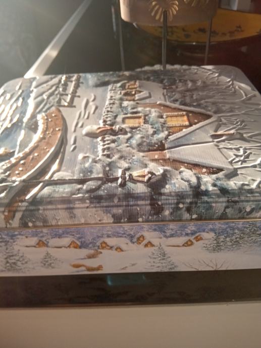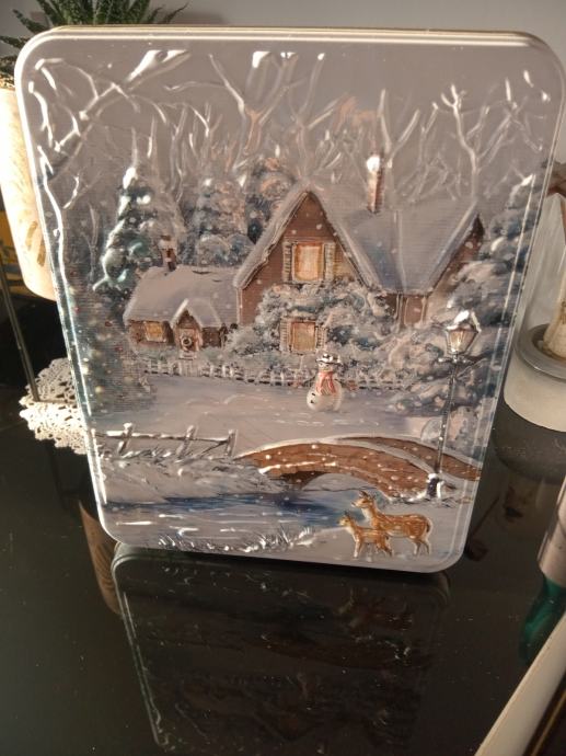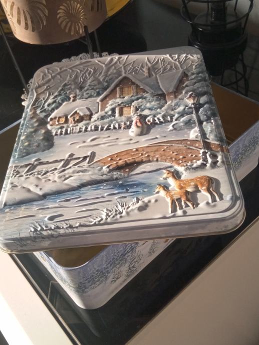 Lijepa limena kutija za Božićne kekse s zimskim motivom promjera 26 /21 cm visina 8 cm